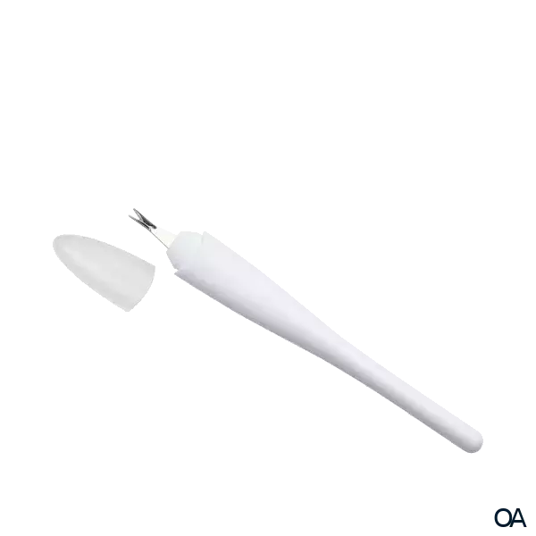 - Am Ende der v-förmigen Aufnahme befindet sich eine Schneide, mit der abstehende Haut und Niednägel abgetrennt werden können.