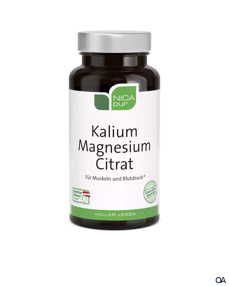 Die vom Elektrolyt Kalium abhängigen Prozesse im Körper benötigen häufig auch Magnesium, weshalb sie auch als physiologische Partner bezeichnet werden. Die Mineralstoffe Kalium und Magnesium leisten einen Beitrag zur normalen Funktion von Nerven und Muskelzellen, nicht zuletzt auch jener des Herzmuskels. Magnesium trägt zum Elektrolytgleichgewicht bei. Zudem ist Kalium an der Regulation des Blutdrucks im Körper beteiligt. NICApur® Kalium Magnesium Citrat enthält eine Kombination der beiden Mineralstoffe als organischen Citratverbindungen.