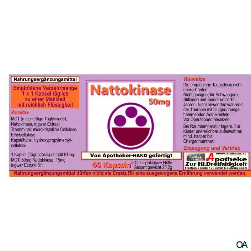 - Zutaten: Fischöl mikroverkapselt, Nattokinase, Ingwer Extrakt, Trennmittel: mikrokristalline Cellulose, Ethylcellulose, Kapselhülle: Hydroxypropylmethylcellulose.