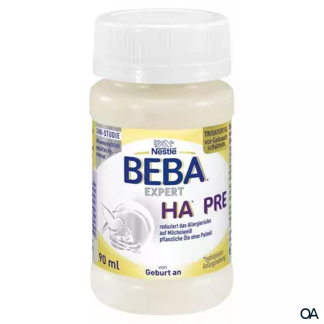 Nestlé Beba HA Pre: Die hydrolysierte Anfangsmilch, speziell entwickelt für Babys mit erhöhtem Risiko für Milchproteinallergien. Trinkfertig und leicht verdaulich, für ein entspanntes Füttern. Enthält schonend aufgespaltenes hydrolisiertes Eiweiß.