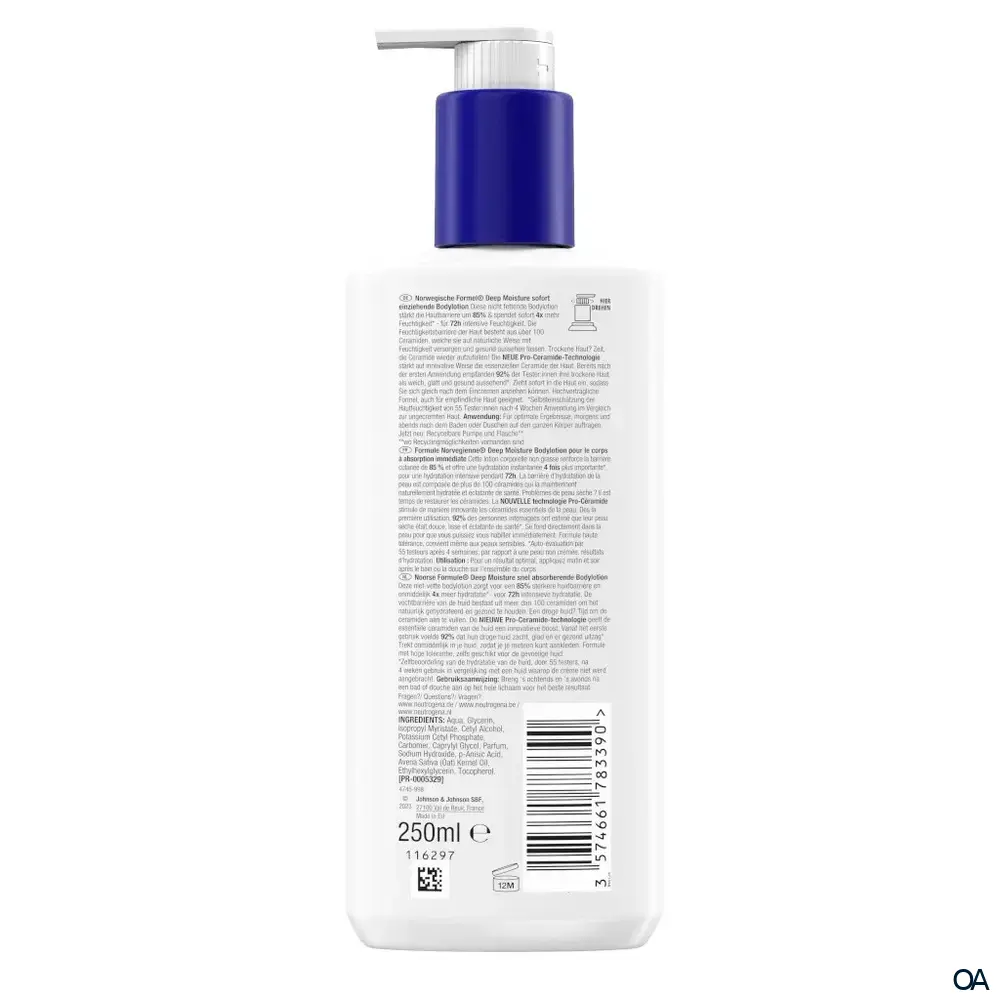 Die besondere Neutrogena Norwegische Formel Deep Moisture sofort einziehende Bodylotion für trockene Haut mit der norwegischen Formel stärkt die Hautbarriere & spendet sofort 4x mehr Feuchtigkeit* - für 72h intensive Feuchtigkeit. Die NEUE Pro-Ceramide-Technologie stärkt auf innovative Weise die essenziellen Ceramide der Haut. Bereits nach der ersten Anwendung empfanden 92% der Tester:innen ihre trockene Haut als weich, glatt und gesund aussehend**. Die nicht fettende Hautpflege Lotion im praktischen Pumpspender zieht sofort in die Haut ein, sodass Sie sich gleich nach dem Eincremen anziehen können. Die Hautcreme ist dank der hochverträglichen Formel auch für empfindliche Haut geeignet. (*vs. ungecremte Haut) (**Selbsteinschätzung, 55 TesterInnen, nach 4 Wochen)