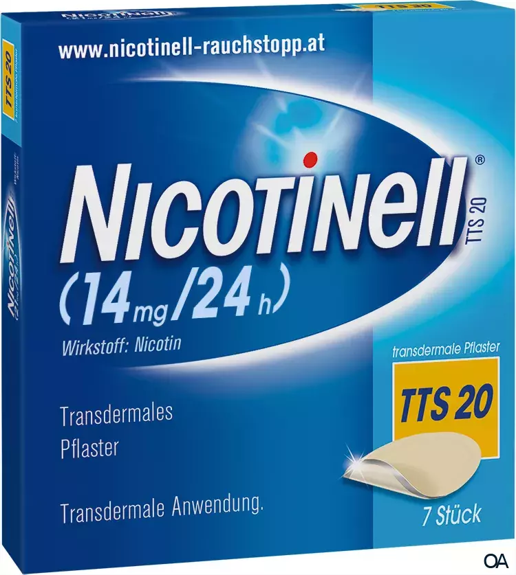 Die Nicotinell® TTS 20 (14mg/24h) transdermale Pflaster sind ein rezeptfreies Nikotinersatzprodukt zur unterstützenden Anwendung bei der Raucherentwöhnung mit dem Wirkstoff Nikotin. Dieser wird über 24h kontinuierlich abgegeben.