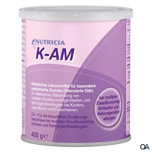 Das Nutricia K-AM Pulver ist ein Lebensmittel für besondere medizinische Zwecke (bilanzierte Diät). Zum Diätmanagement bei Kindern, Jugendlichen und Erwachsenen mit multiplen Eiweißunverträglichkeiten und Nahrungsmittelallergien.