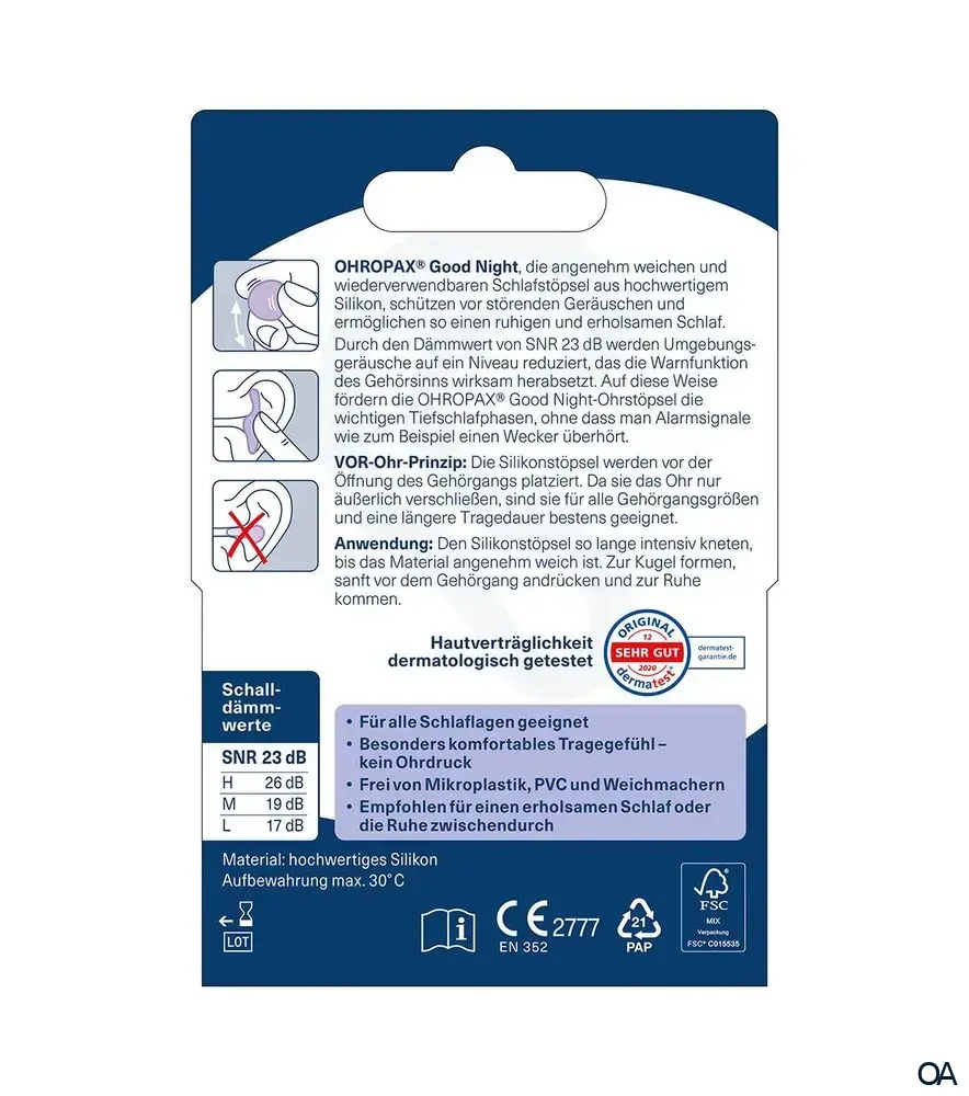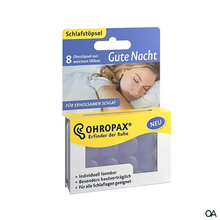 Das hat jetzt ein Ende, denn die OHROPAX® GOOD NIGHT-Schlafohrstöpsel gehören zu den VOR-Ohr-Stöpseln. Sie bestehen aus hochwertigem, reinem Silikon, der individuell formbar ist. Dies garantiert einen perfekt angepassten Sitz vor dem Gehörgang und ermöglicht so einen erholsamen Schlaf in jeder Schlafposition, ohne den Wecker oder andere Alarmsignale zu überhören. Gut, dass es OHROPAX® GOOD NIGHT gibt – Schlafen Sie gut, tief und fest.