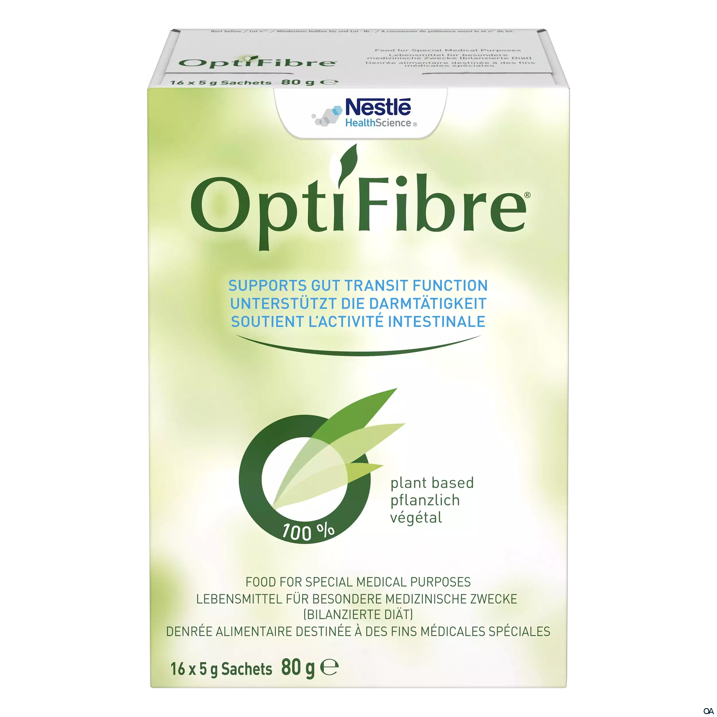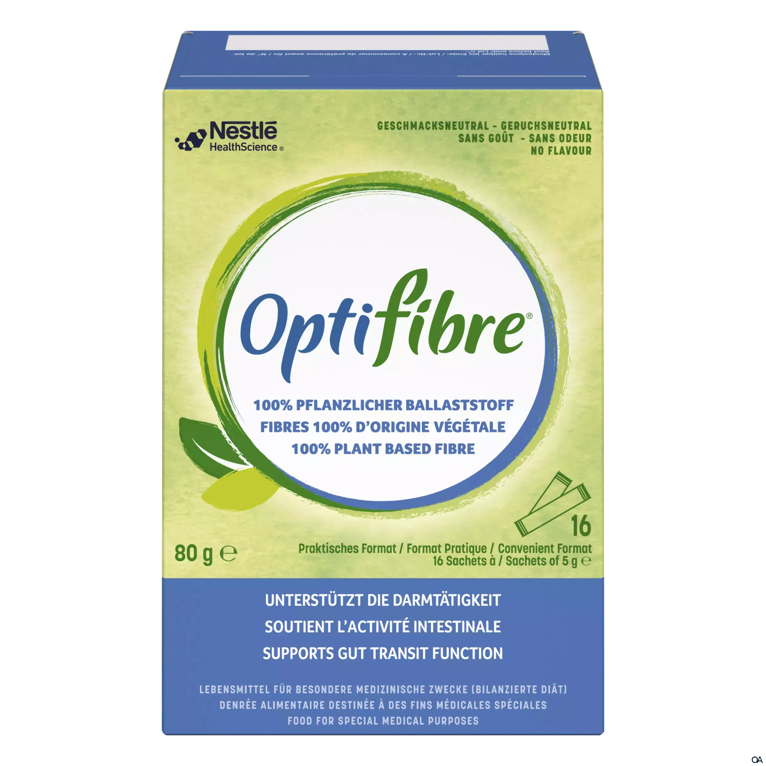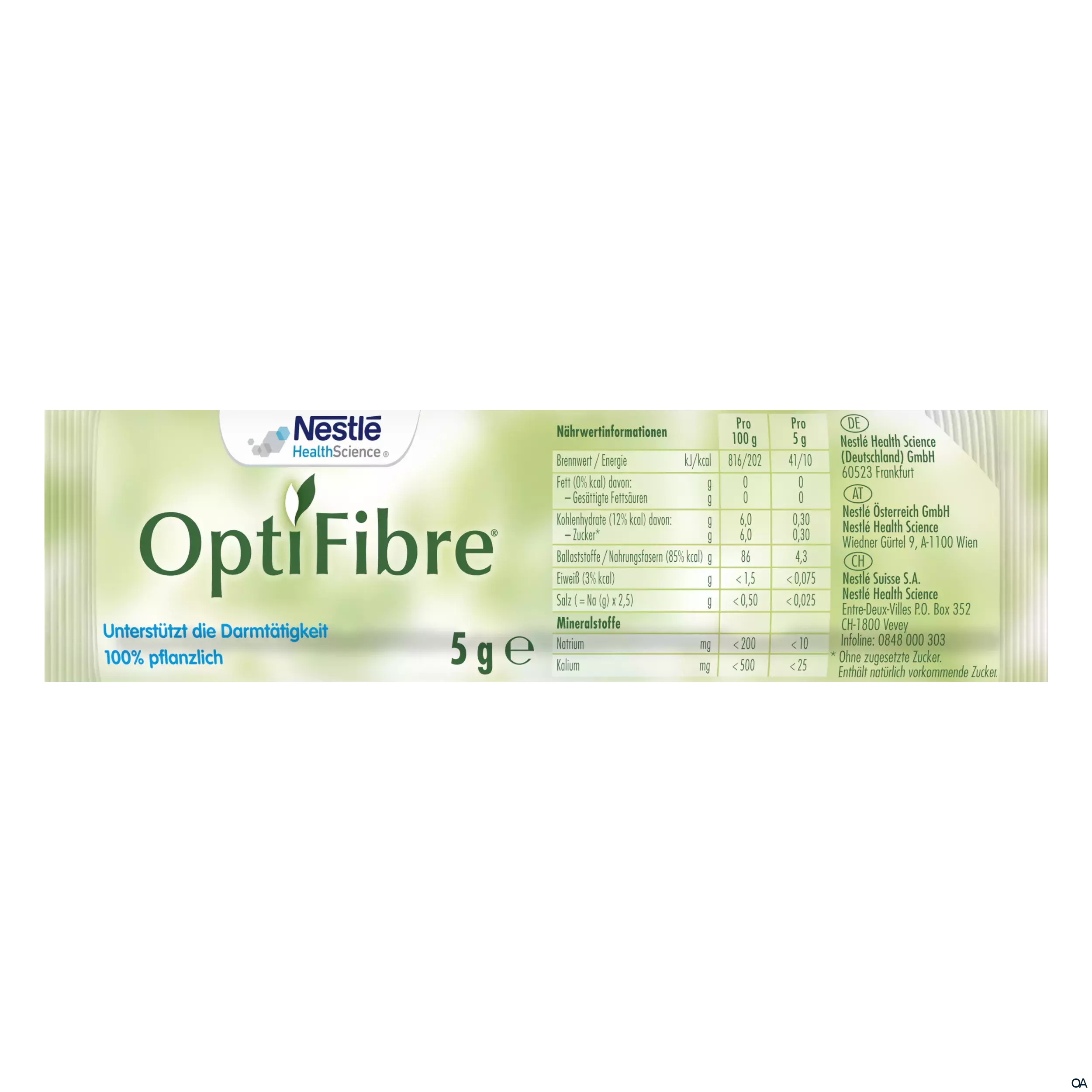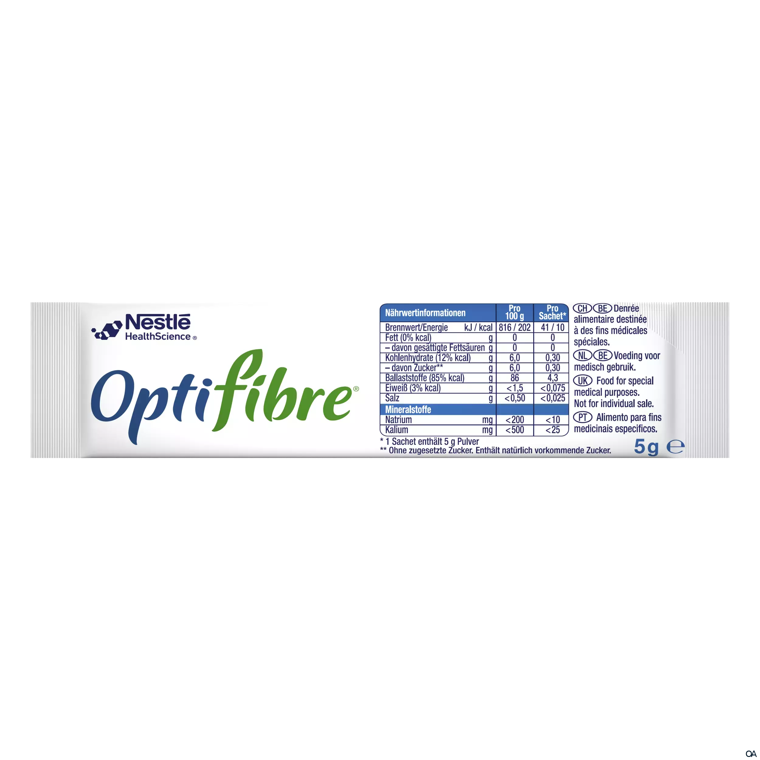- OptiFibre ist geschmacksneutral und kann daher in allen Flüssigkeiten verrührt werden. Die exakten Dosierungsanweisungen nach Alter und Art der Anwendung finden Sie auf der Verpackung des Produkts. Der Hersteller empfiehlt zum Start 1 Stick bzw. 5 g OptiFibre Pulver pro Tag in ca. 200 ml Flüssigkeit zu verrühren. Zur weiterführenden bilanzierten Diät können täglich 1 - 5 Sticks eingenommen werden.