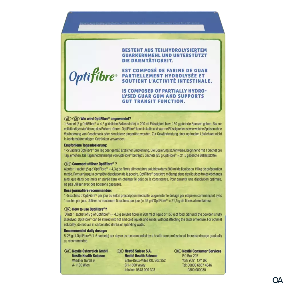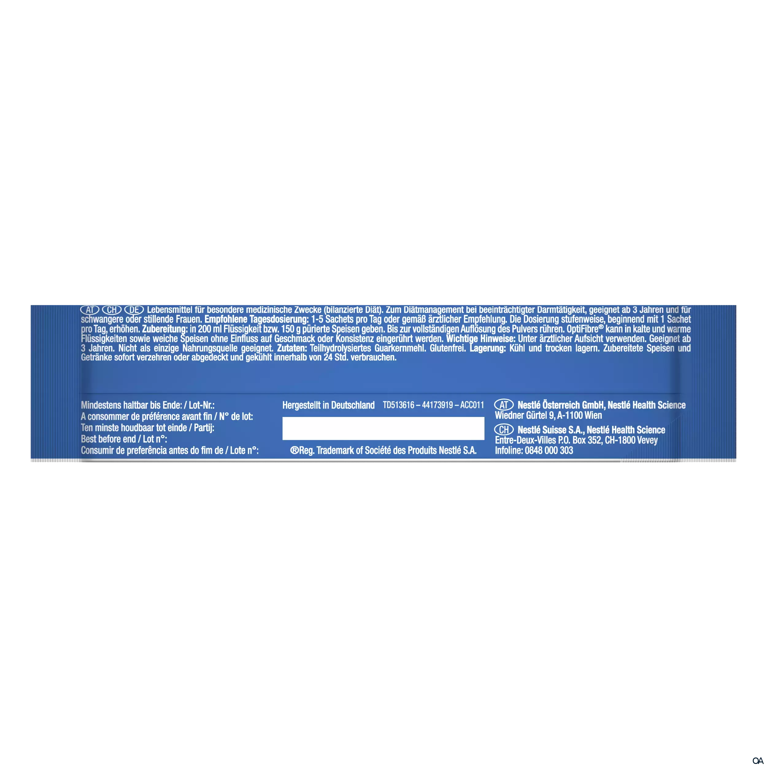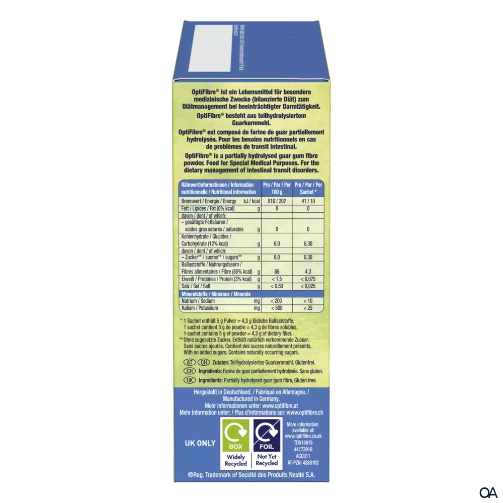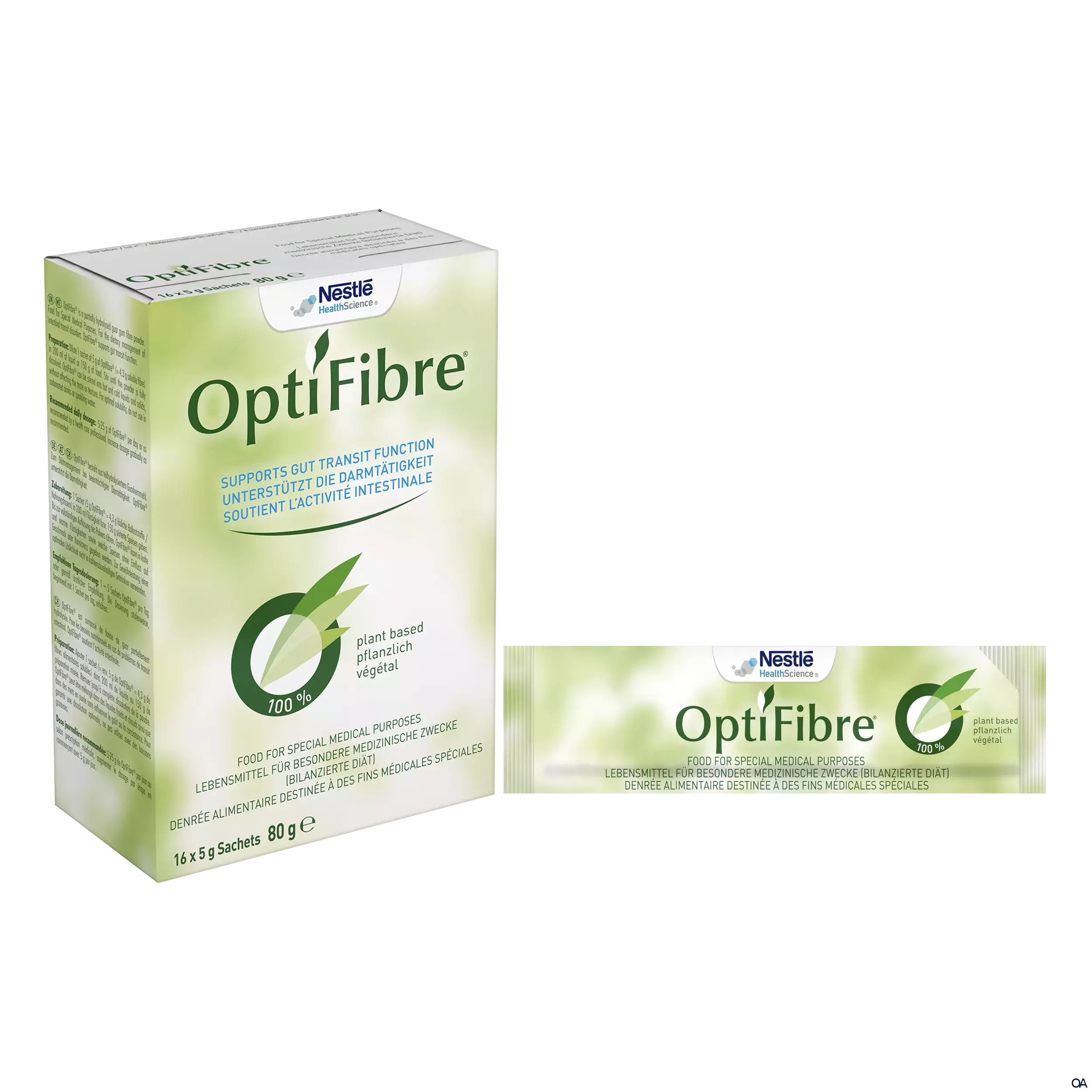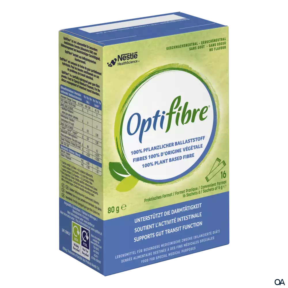 - OptiFibre ist geschmacksneutral und kann daher in allen Flüssigkeiten verrührt werden. Die exakten Dosierungsanweisungen nach Alter und Art der Anwendung finden Sie auf der Verpackung des Produkts. Der Hersteller empfiehlt zum Start 1 Stick bzw. 5 g OptiFibre Pulver pro Tag in ca. 200 ml Flüssigkeit zu verrühren. Zur weiterführenden bilanzierten Diät können täglich 1 - 5 Sticks eingenommen werden.