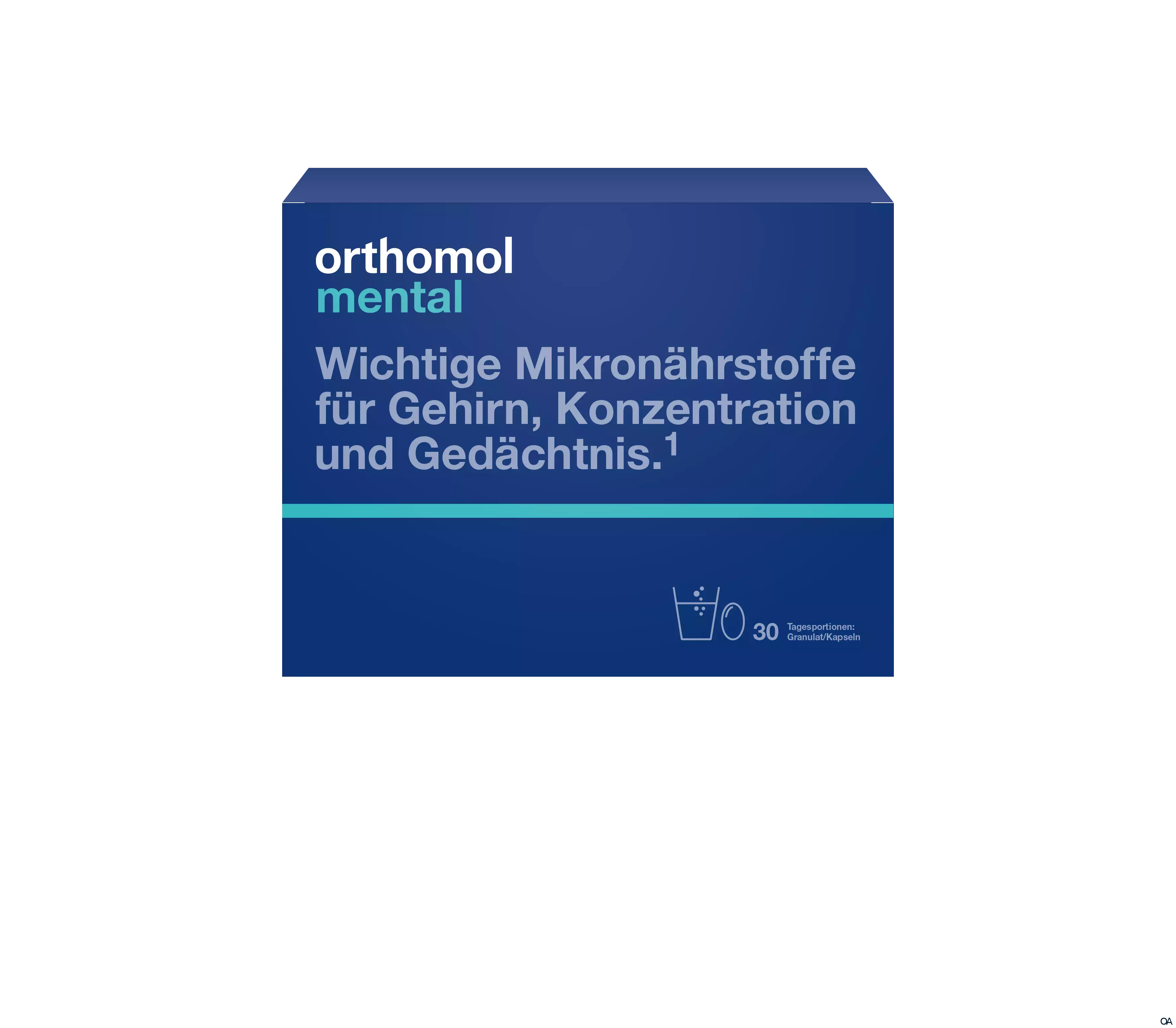 Orthomol Mental ist ein Nahrungsergänzungsmittel und besteht aus einer Mikronährstoffkombination, welche über 20 verschiedene Inhaltsstoffe enthält, die in ihrer Zusammensetzung aufeinander abgestimmt wurden, um so die mentale Leistungsfähigkeit gezielt zu unterstützen. Das Gehirn benötigt neben einer ausreichenden Sauerstoff- und Energieversorgung auch spezifische Mikronährstoffe für eine optimale Funktions- und Leistungsfähigkeit. Orthomol Mental ist eine Kombination aus unterschiedlichen Mikronährstoffen für Gehirn, Konzentration und Gedächtnis. Es enthält u. a. Pantothensäure zur Unterstützung der mentalen Leistungsfähigkeit.