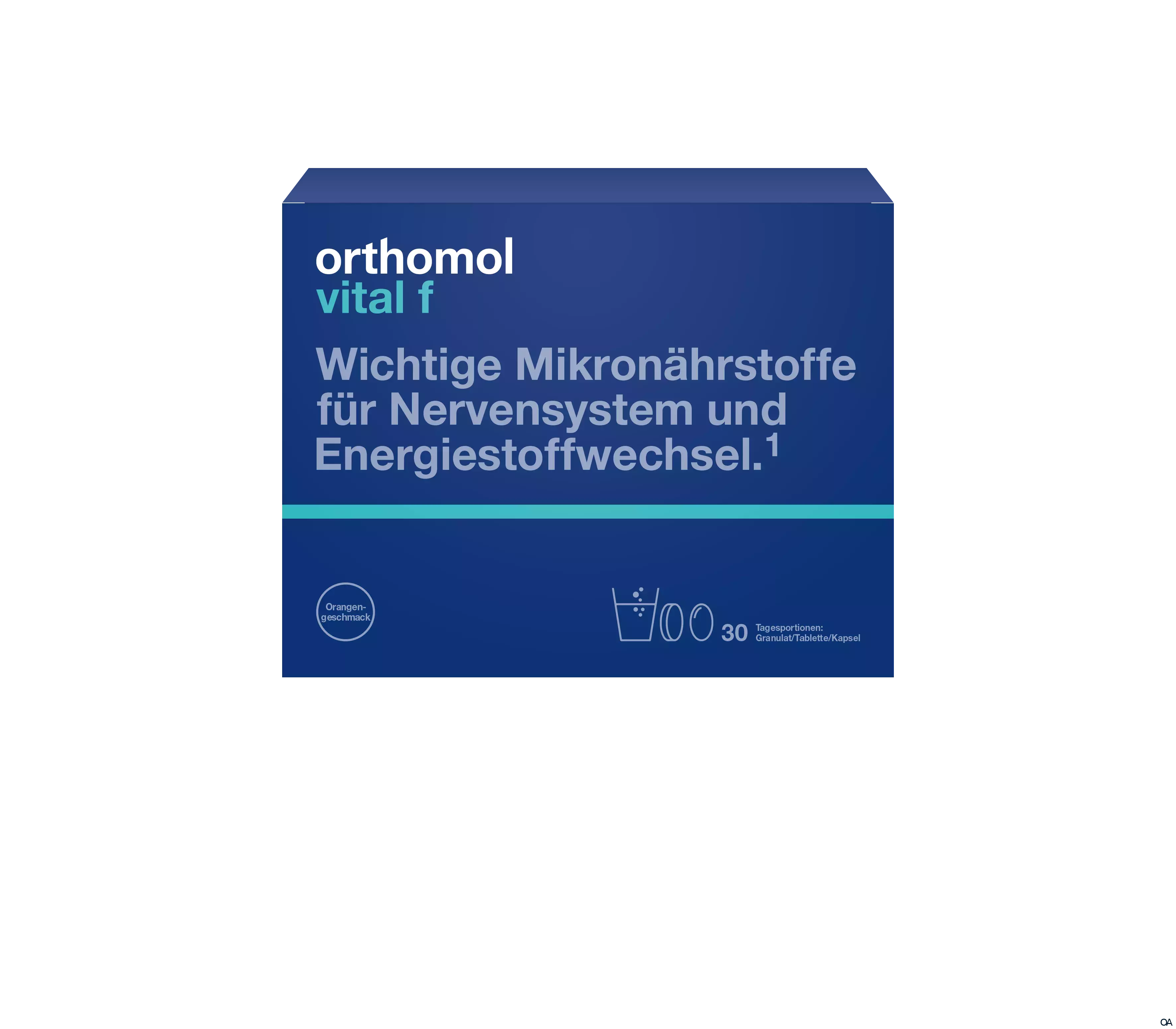 Orthomol Vital f ist eine Mikronährstoffkombination für Frauen. Insbesondere im hektischen Alltag wird eine ausgewogene Ernährung oft vernachlässigt. Wenn die Zeit knapp ist, greifen „Stressesserinnen“ gern zu Fast Food und Süßigkeiten - mikronährstoffarmen Lebensmitteln; „Stresshungerinnen“ dagegen schränken die Nahrungsaufnahme in solchen Phasen stark ein. Dabei braucht der Körper gerade jetzt, in Phasen hoher Belastung, ausreichend Vitamine und Mineralstoffe, die er größtenteils nicht selbst bilden kann. Denn in Phasen hoher Belastung, sei es z. B. durch die Doppelbelastungen von Familie und Beruf oder die Betreuung pflegebedürftiger Angehöriger, neigen wir dazu, eine ausgewogene Ernährung zu vernachlässigen. Orthomol Vital f ist ein Nahrungsergänzungsmittel. Es enthält wichtige Mikronährstoffe u. a. B-Vitamine und Magnesium zur Verringerung von Müdigkeit und Erschöpfung. Enthält Omega-3-Fettsäuren und Calcium.