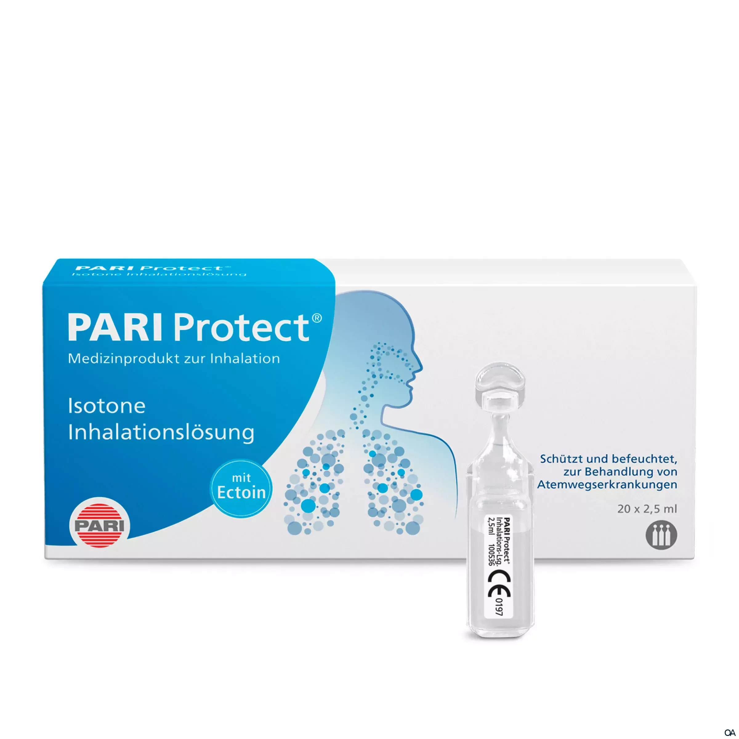 - PARI ProtECT® Inhalationslösung schützt vor Austrocknung und befeuchtet die Schleimhäute der Atemwege wenn sie z. B. Feinstaub, Pollen, Schmutz oder trockener Luft in geheizten oder klimatisierten Räumen ausgesetzt sind.