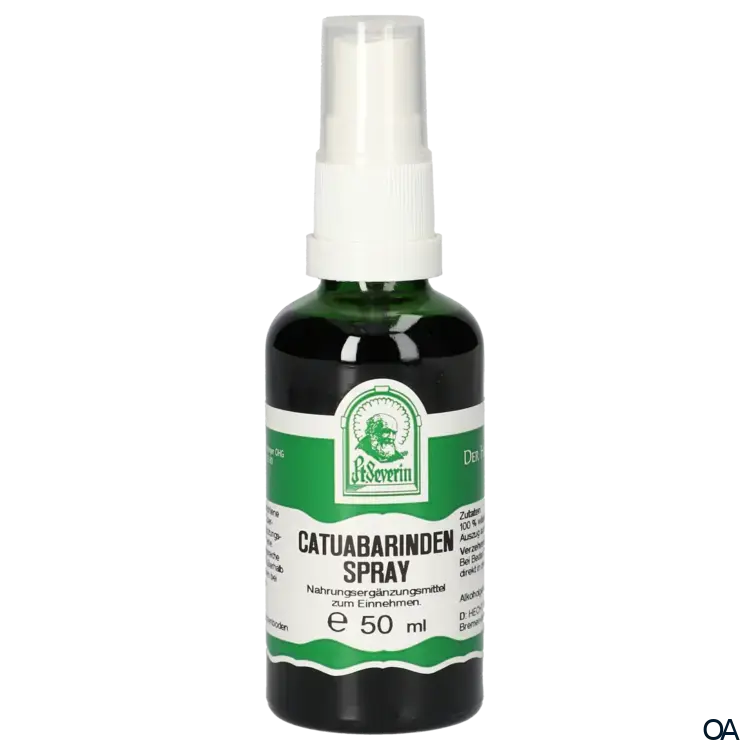 Zusammensetzung: Catuabarindenspray enthält einen hochwertigen wässrig/alkoholischen Auszug aus Catuabarinde, laut Arzneibuch hergestellt. Alkoholgehalt: 66 % Vol.