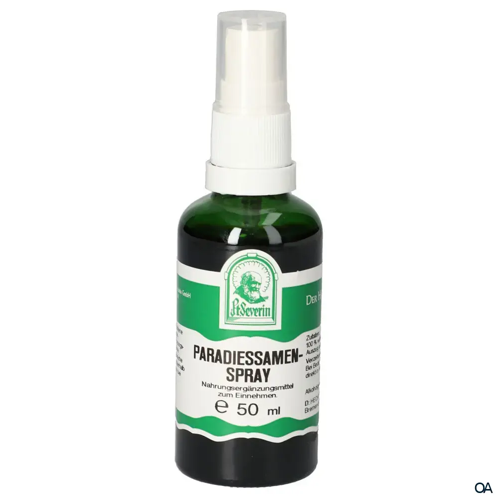 Der Pater Severin Paradiessamen Spray ist ein Nahrungsergänzungsmittel nach alter Klosterrezeptur zum Einnehmen. Hergestellt aus einem wässrig/alkoholischen Auszug aus Paradiessamen.