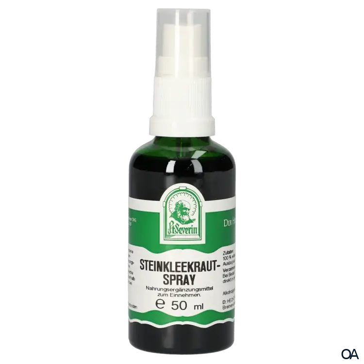 Zusammensetzung: Steinkleekrautspray enthält einen hochwertigen wässrig/alkoholischen Auszug aus Steinkleekraut. Der Auszug wird nach Vorgaben des Arzneibuches im Verhältnis 1:5 hergestellt. Alkoholgehalt: 66 % Vol.