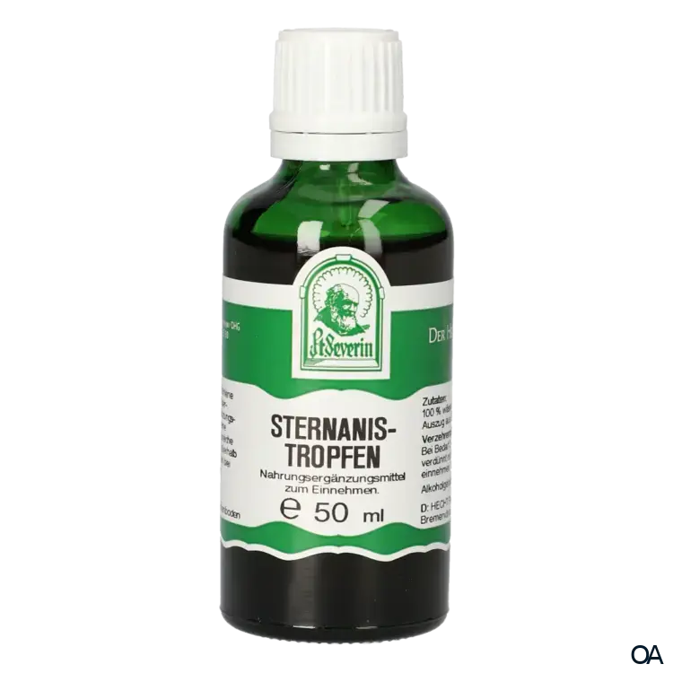 Zusammensetzung: Sternanistropfen enthalten einen hochwertigen wässrig/alkoholischen Auszug aus Sternanisfrüchten. Der Auszug wird nach Vorgaben des Arzneibuches im Verhältnis 1:5 hergestellt. Alkoholgehalt: 66 % Vol.