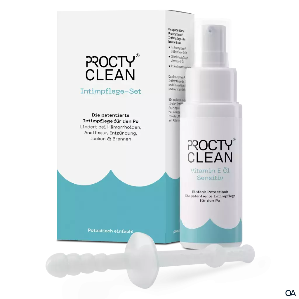 - Das ProctyClean® Intimpflege-Set verbessert zahlreiche Beschwerden rund um Ihren Analbereich. Das Set führt bei Analjucken, leichten Entzündungen, Analekzemen, Marisken, Stuhlschmieren, Stuhlinkontinenz leichten bis mittleren Grades sowie Hämorrhoiden.