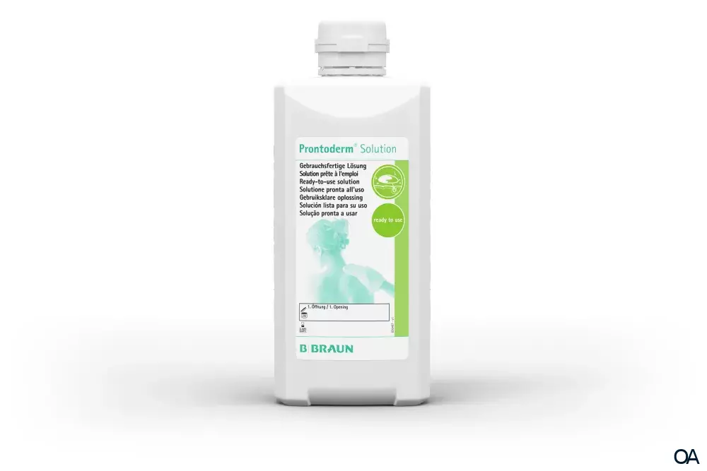 - Wässrige gebrauchsfertige Lösung zur antiseptischen Ganzkörperreinigung bei MRE. Entsprechendes Hautareal mit Prontoderm® Lösung abspülen bzw. mit frischem Waschlappen sanft abreiben. Löst verkrustete Sekrete in der Nase.