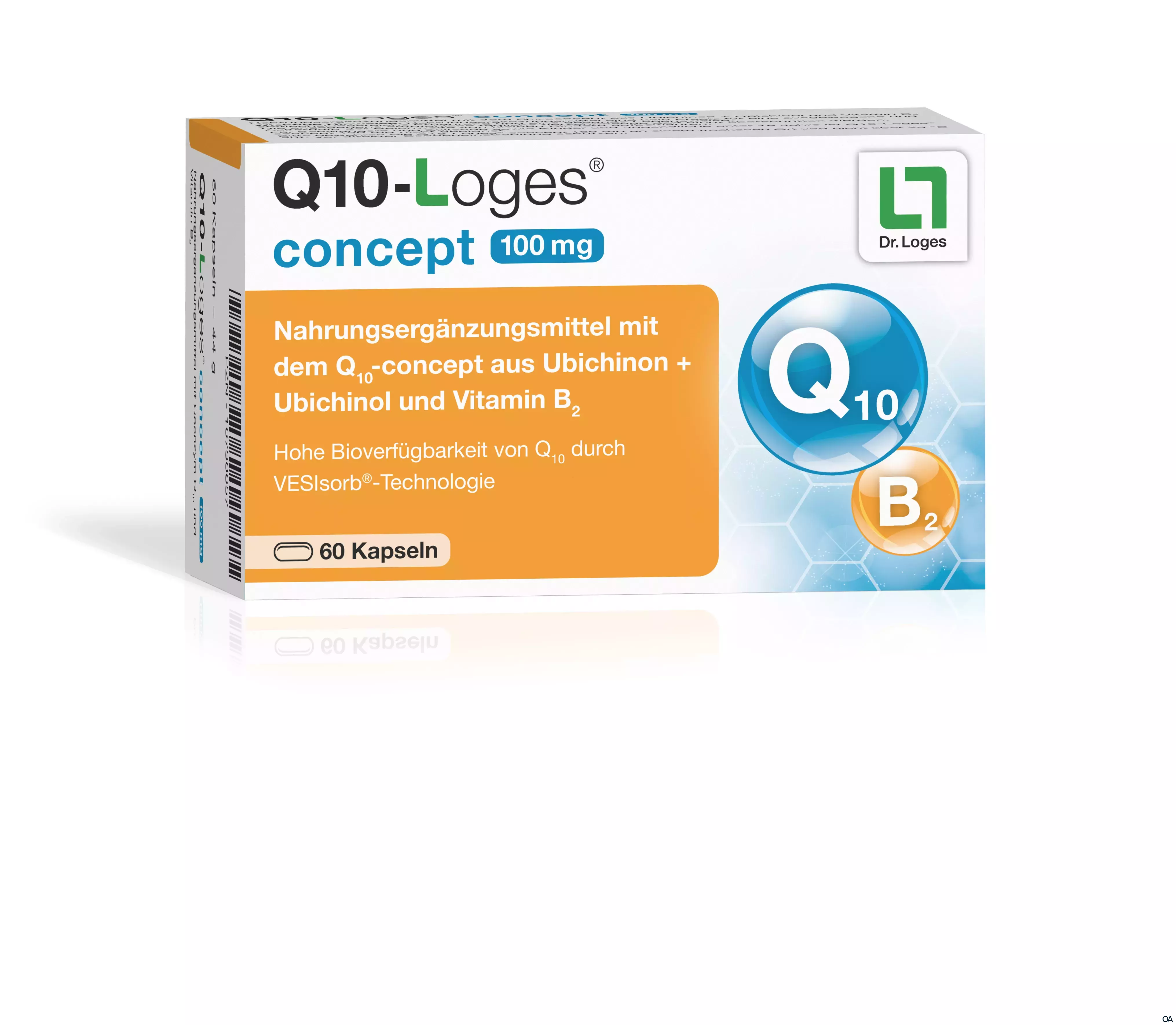 Q10-Loges® concept 100 mg bietet beide Formen des Q10-Systems vereint in einer Kapsel an. Durch eine besondere technologische Formulierung verfügt Q10-Loges® concept 100 mg über eine hohe Bioverfügbarkeit. Die VESIsorb®-Technologie ermöglicht die Löslichkeit und Bioverfügbarkeit der schwer wasserlöslichen Coenzym Q10-Formen als Zubereitung für die orale Aufnahme mit nur einer Kapsel. In dieser Aufbereitung bleibt die Kombination stabil. Ergänzt und abgerundet wird das Q10-concept aus Ubichinon + Ubichinol durch Vitamin B2 . Auch als Riboflavin bekannt, trägt Vitamin B2 dazu bei, die Zellen vor oxidativem Stress zu schützen. Zudem trägt Vitamin B2 zu einem normalen Energiestoffwechsel bei.