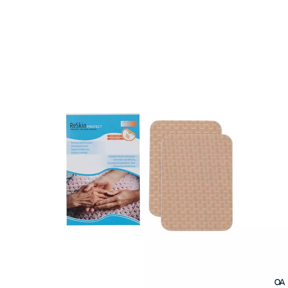 - ReSkin Protect direkt auf das empfindliche Hautgewebe auftragen, darauf achten, dass Sie die Haut sauber und trocken ist. ReSkin Protect mindert die Auswirkungen von Reibungs- und Scherkräften und unterstützt das empfindliche, pergamentdünne Hautgewebe. ReSkin Protect ist ein atmungsaktives, hautfreundliches Pflaster, das schmerzfrei entfernt werden kann.