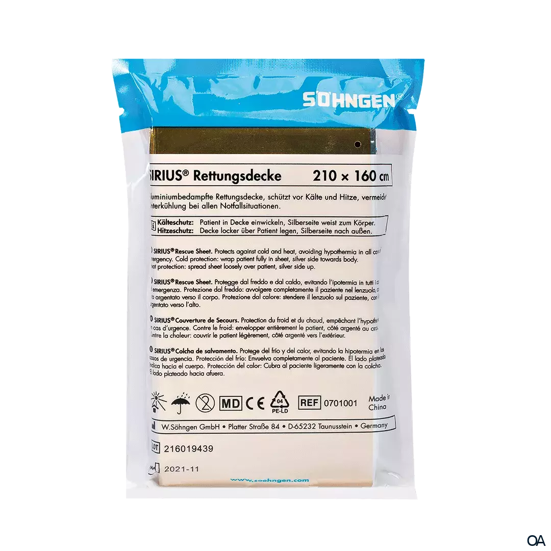 Die SIRIUS® Rettungsdecke ist eine aluminiumbedampfte Rettungsdecke mit einer goldenen und silbernen Seite. Diese schützt vor Kälte und Hitze und vermeidet Unterkühlung bei allen Notfallsituationen.