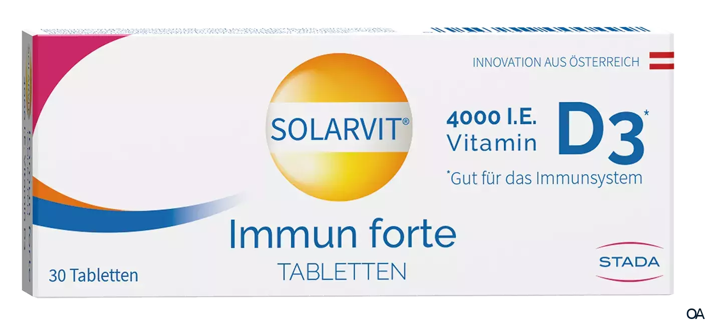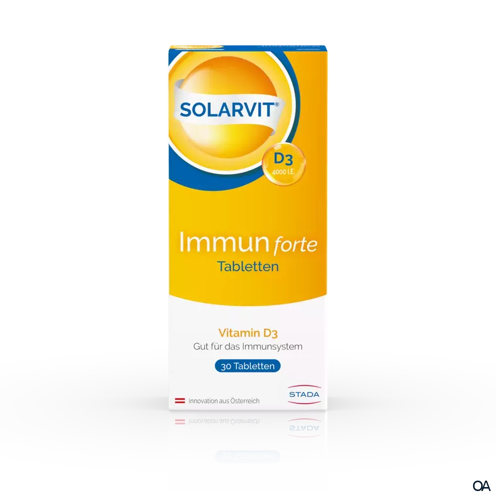 SOLARVIT® Immun forte Tabletten sind ein hochdosiertes Nahrungsergänzungsmittel mit 4000 I.E. Vitamin D3. Vitamin D trägt zu einer normalen Funktion des Immunsystems und Knochen bei.