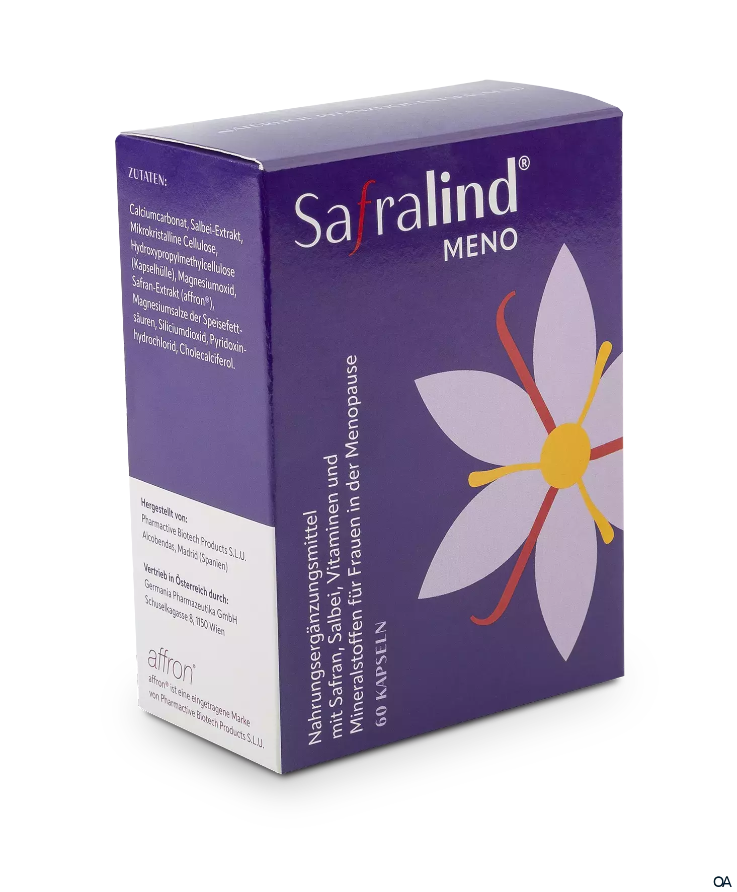 Safralind® MENO ist ein Nahrungsergänzungsmittel, das speziell zur Einnahme in den Wechseljahren entwickelt wurde. Es enthält Vitamine, Spurenelemente und Pflanzenextrakte, die frei von Phytoöstrogenen sind. Der Extrakt aus SAFRAN hilft dabei, eine gute Stimmung zu behalten. SALBEI unterstützt dabei, normal zu schwitzen. VITAMIN B6 trägt zur Regulierung der Hormontätigkeit und MAGNESIUM zu einer normalen Muskelfunktion bei. CALCIUM wird für die Erhaltung normaler Knochen benötigt und VITAMIN D trägt zu einem normalen Calciumspiegel im Blut bei.