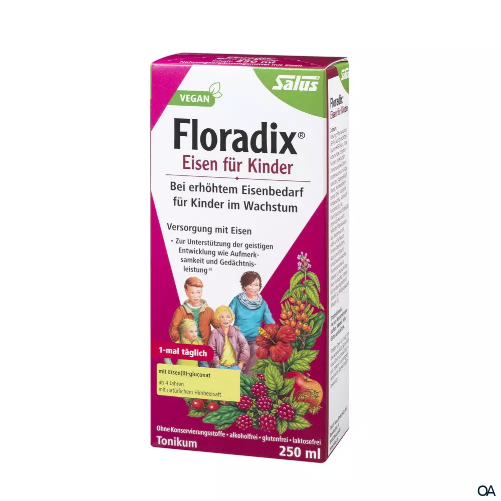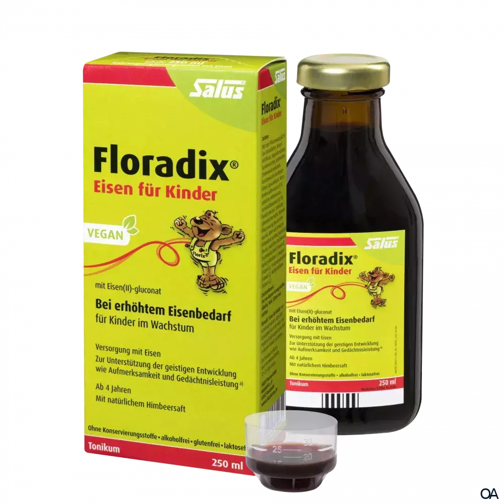 Floradix® Eisen für Kinder wurde für die normale geistige Entwicklung bei Kindern entwickelt. Es basiert auf unserem bewährten Floradix® mit Eisen-Tonikum. Das Nahrungsergänzungsmittel Floradix® Eisen für Kinder gewährleistet die Versorgung mit gut verfügbarem zweiwertigen Eisen schon bei normalem Bedarf. Jede Zelle des Körpers benötigt zur Energiegewinnung neben Glukose auch Sauerstoff. Das eisenhaltige Hämoglobin in den roten Blutkörperchen nimmt Sauerstoff in der Lunge auf und transportiert diesen mit der Blutzirkulation zu den Zellen. Im Wachstumsalter wird Eisen für den Aufbau des Blutfarbstoffs Hämoglobin zum Sauerstofftransport benötigt.