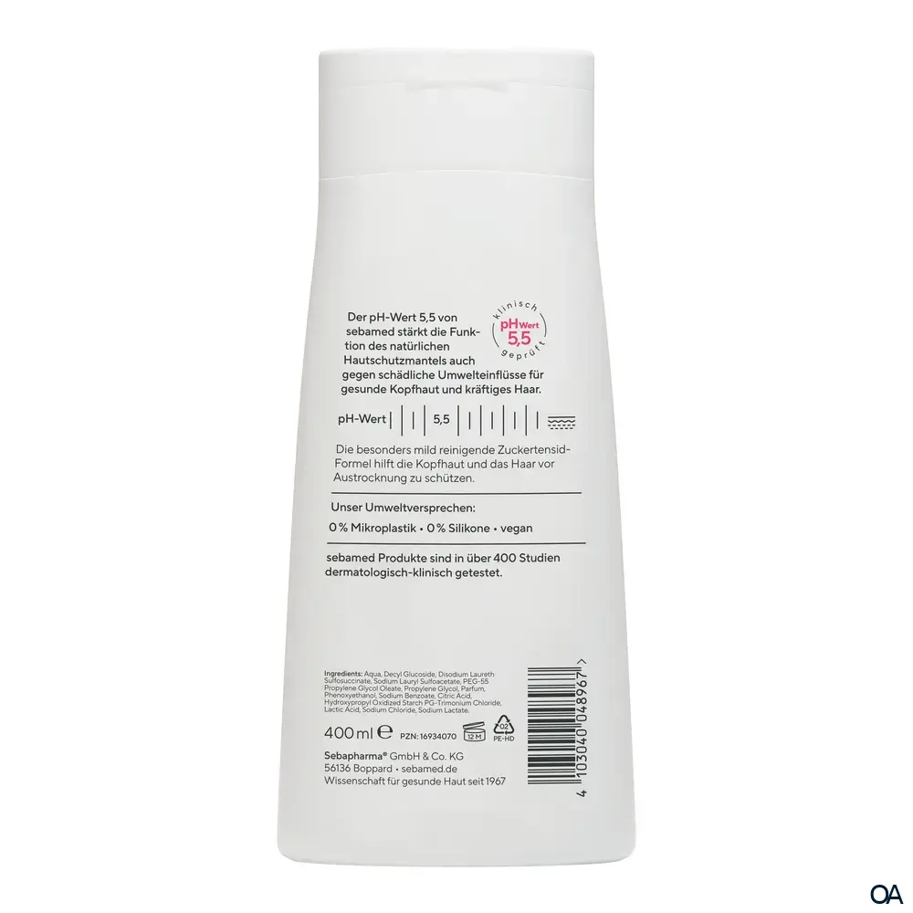 Aqua, Decyl Glucoside, Disodium Laureth Sulfosuccinate, Sodium Lauryl Sulfoacetate, PEG-55 Propylene Glycol Oleate, Propylene Glycol, Parfum, Phenoxyethanol, Sodium Benzoate, Citric Acid, Hydroxypropyl Oxidized Starch PG-Trimonium Chloride, Lactic Acid, Sodium Chloride, Sodium Lactate. Die aufgeführten Inhaltsstoffe entsprechen dem aktuellen Stand der Produktion. Unsere Firmenphilosophie „Wissenschaft für gesunde Haut“ lassen wir durch regelmäßige Überarbeitung unserer Rezepturen – auf Basis wissenschaftlicher Erkenntnisse – in die sebamed Produkte einfließen. Daher sind immer die Informationen auf dem Produkt ausschlaggebend.