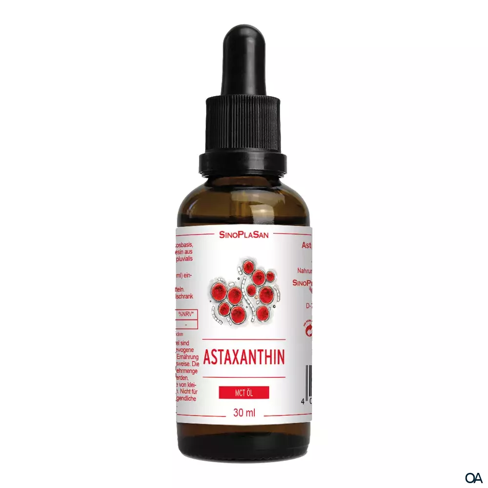 Die SinoPlaSan Astaxanthin Tropfen sind ein Nahrungsergänzungsmittel mit MCT Öl aus der Blutregenalge (Haemotococcus pluvialis). Astaxanthin ist ein bekanntes Antioxidans.
