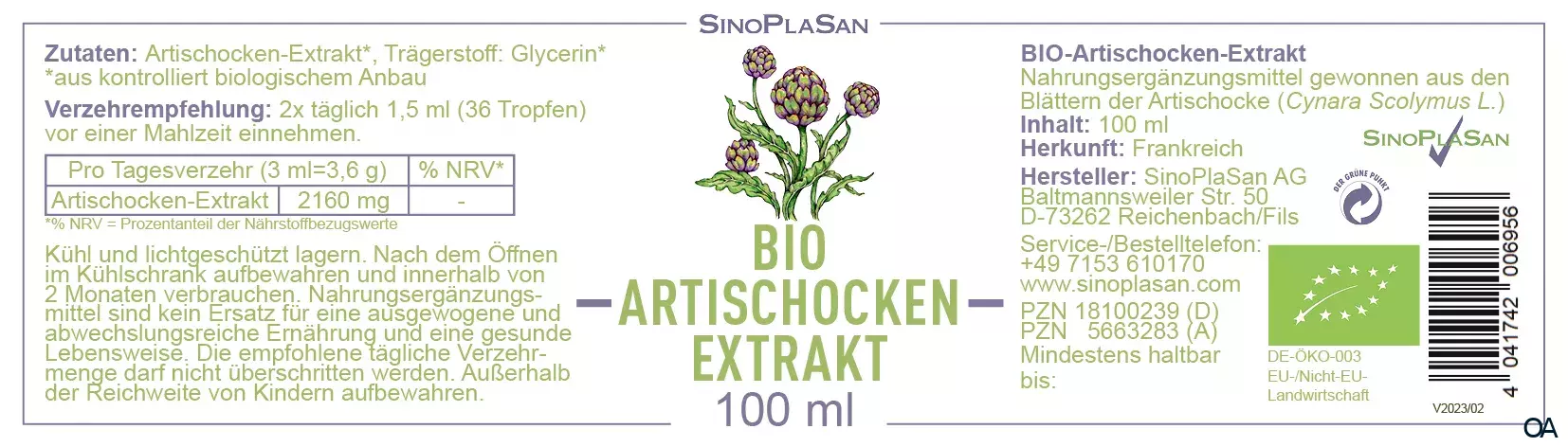 - Zutaten: Artischocken-Extrakt*, Trägerstoff: Glycerin*. *aus kontrolliert biologischem Anbau.