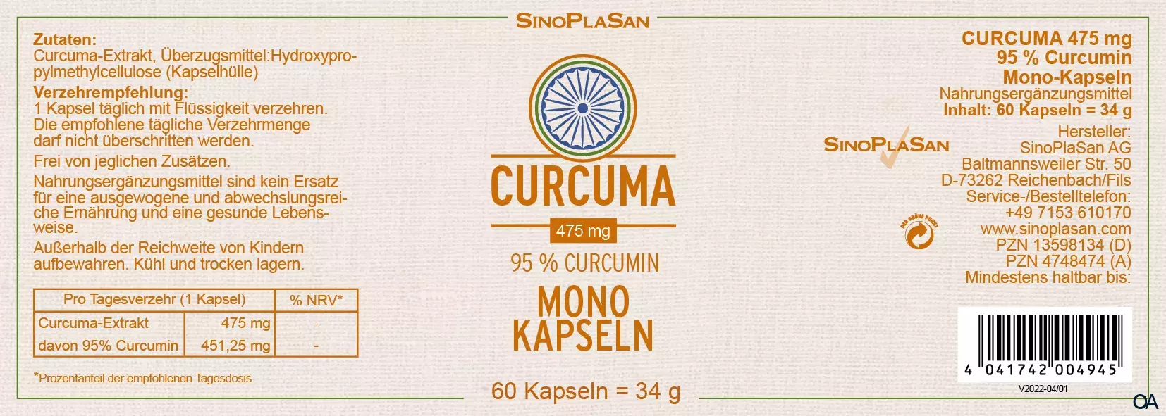 - Zusammensetzung pro Tagesdosis (1 Kapsel): 475 mg Curcuma-Extrakt und davon 451,25 mg Curcumin.