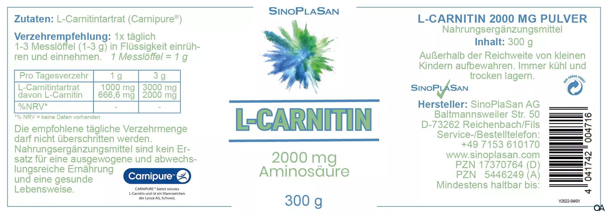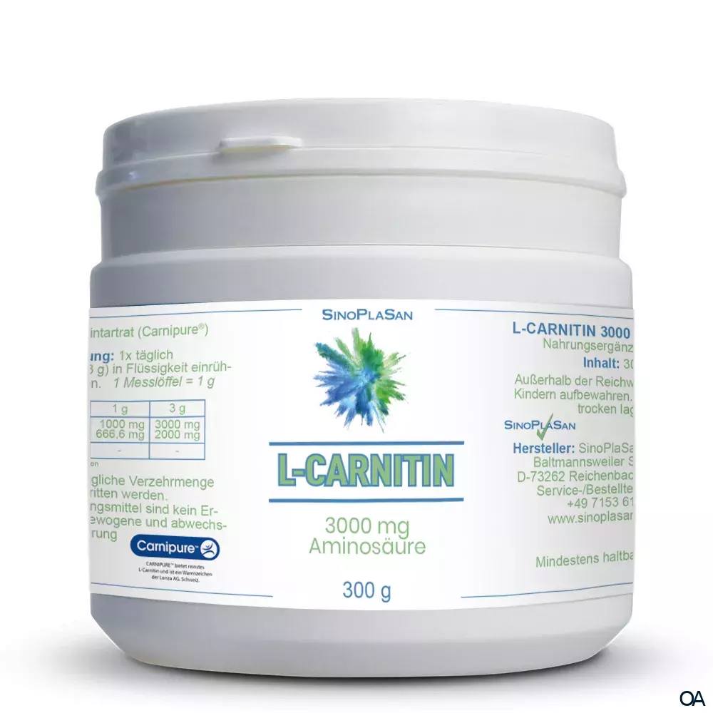 Das SinoPlaSan L-Carnitin 2000 mg Pulver ist ein Nahrungsergänzungsmittel mit L-Carnitin. L-Carnitin ist eine Proteinverbindung der beiden essenziellen Aminosäuren Lysin und Methionin.