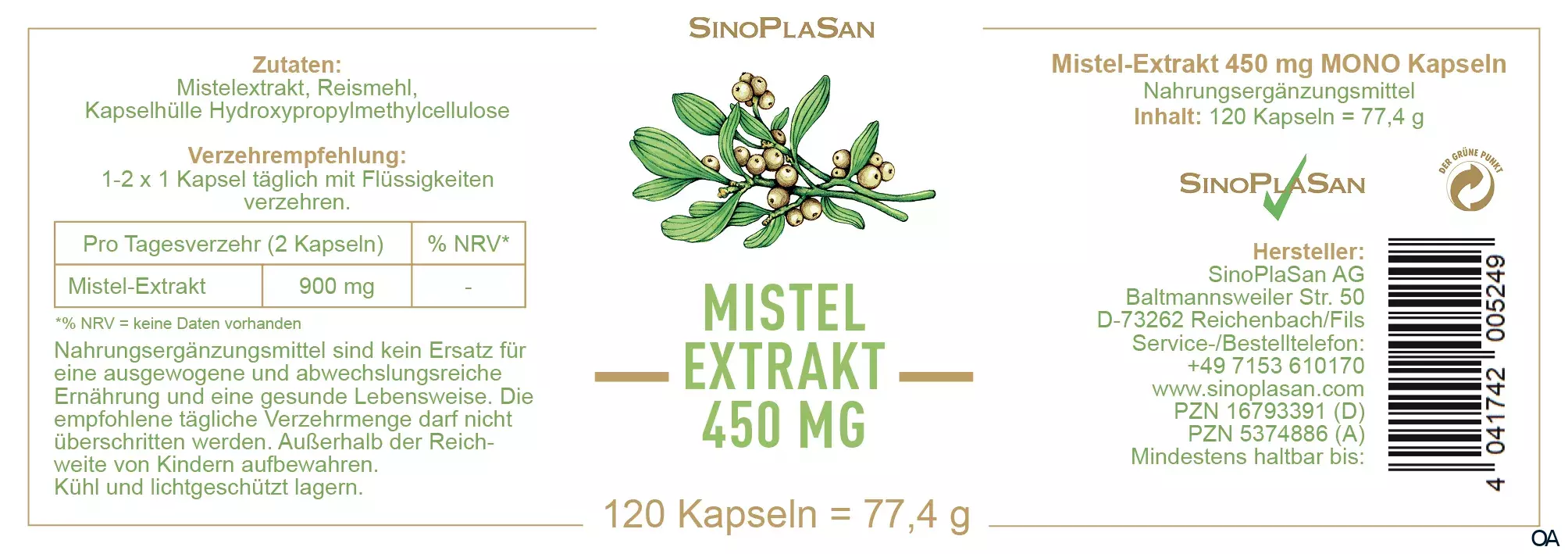 Die SinoPlaSan Mistelextrakt 450 mg MONO Kapseln sind ein hochdosiertes Nahrungsergänzungsmittel mit Mistelextrakt. Der Extrakt enthält wertvolle Inhaltsstoffe, die das Immunsystem unterstützen können.