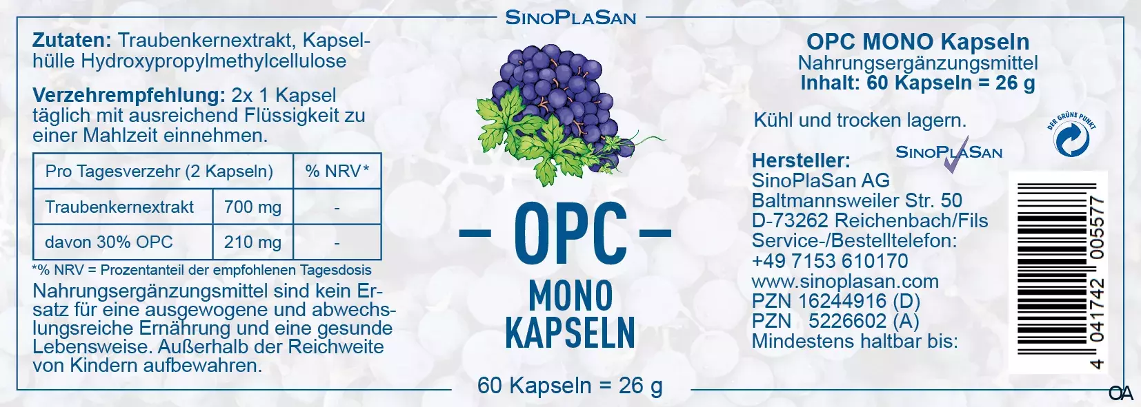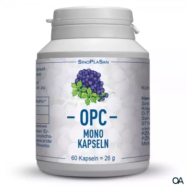 SinoPlaSan OPC MONO Kapseln sind ein Nahrungsergänzungsmittel und enthalten 105 mg reines OPC pro Kapsel und sind frei von Zusatzstoffen. OPC ist ein starkes Antioxidans, das aus den Schalen und Kernen von Weintrauben gewonnen wird.