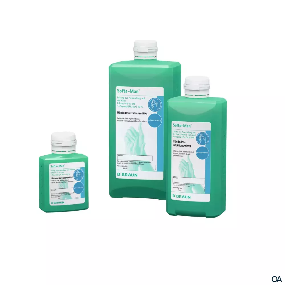 - Softa-Man® unverdünnt in mehreren Portionen zu 2 – 3 ml in die trockenen Hände und Unterarme einreiben, Einwirkungszeit mindestens 60 Sekunden.