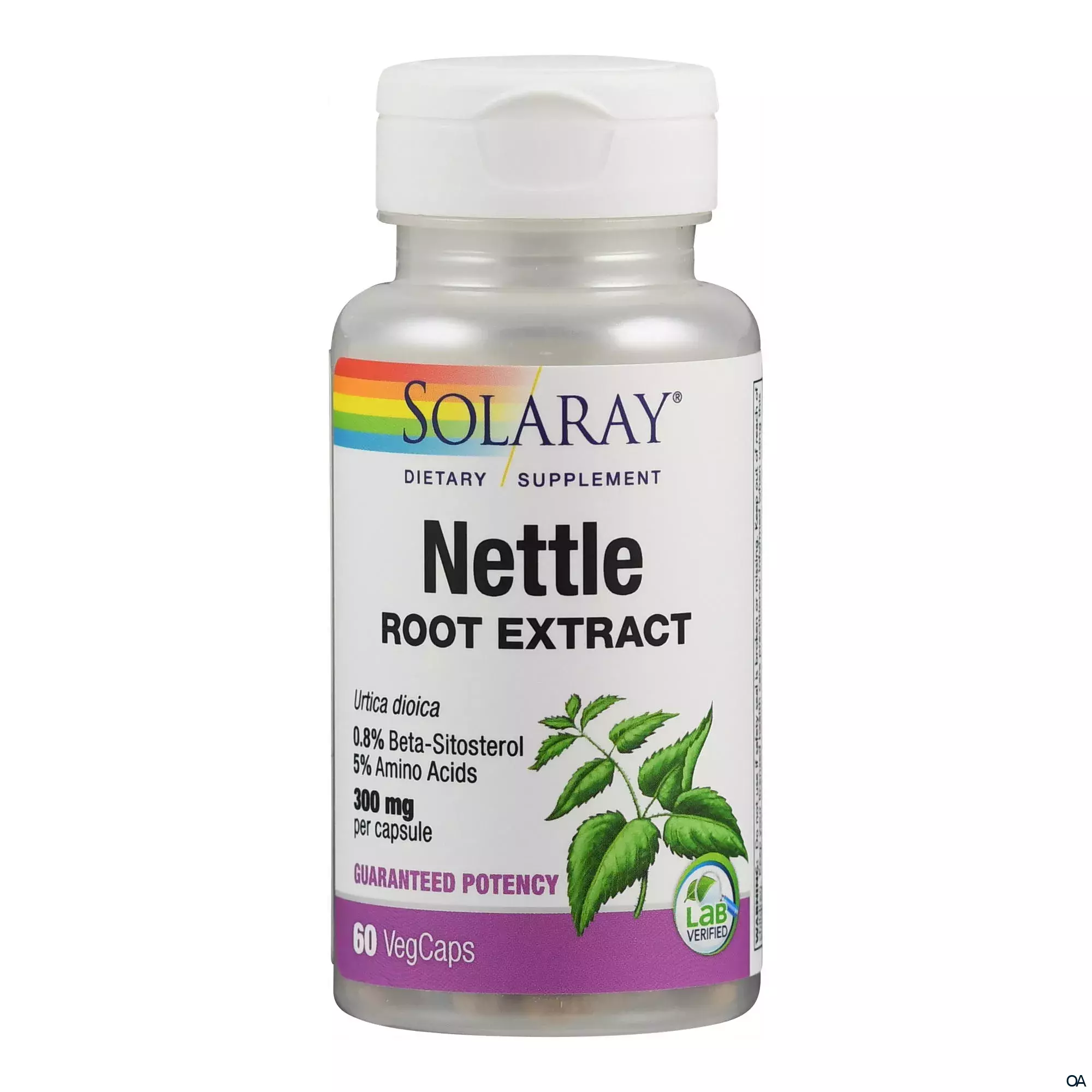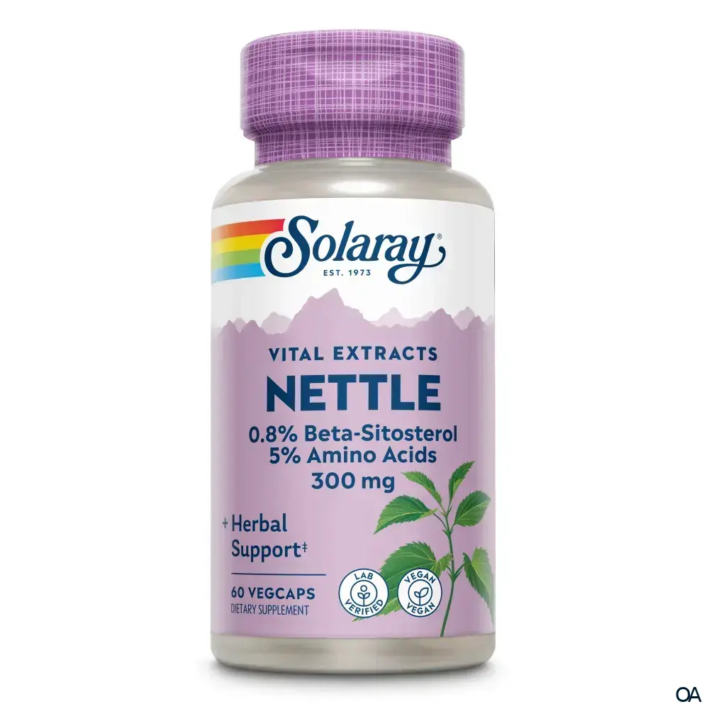 Brennnesselwurzel von Solaray liefert 150 mg Wurzel und 300 mg Wurzelextrakt pro Kapsel. Der Wurzelextrakt besitzt einen garantierten Gehalt von 0,8 % Beta-Sitosterol und 5 % Aminosäuren.