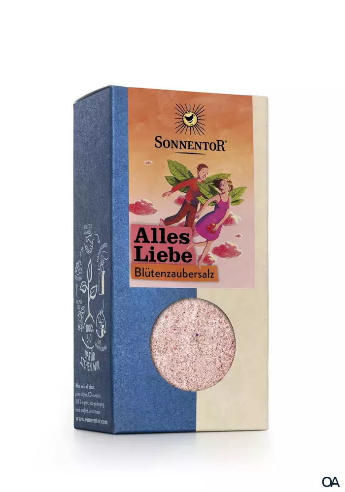 Das Sonnentor Alles Liebe Blütenzaubersalz ist eine aromatische Bio-Gewürzmischung, die mit fruchtigen und blumigen Noten verzaubert. Hergestellt aus Meersalz, Rosenblüten, rosa Pfeffer, Himbeerstücken und weiteren Zutaten.