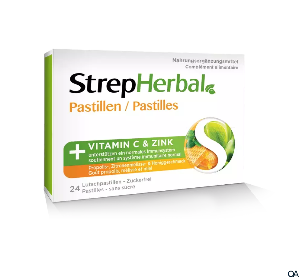 StrepHerbal Pastillen Propolis-, Zitronenmelisse- & Honiggeschmack enthalten natürlichen Propolis-Extrakt und Zitronenmelissenöl. Die Kombination aus wertvollem Kräuteröl und natürlichen Extrakten gibt den StrepHerbal Pastillen ihren unverwechselbaren Geschmack. Die essentiellen Nährstoffe Vitamin C & Zink unterstützen ein normales Immunsystem.