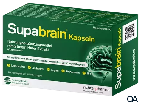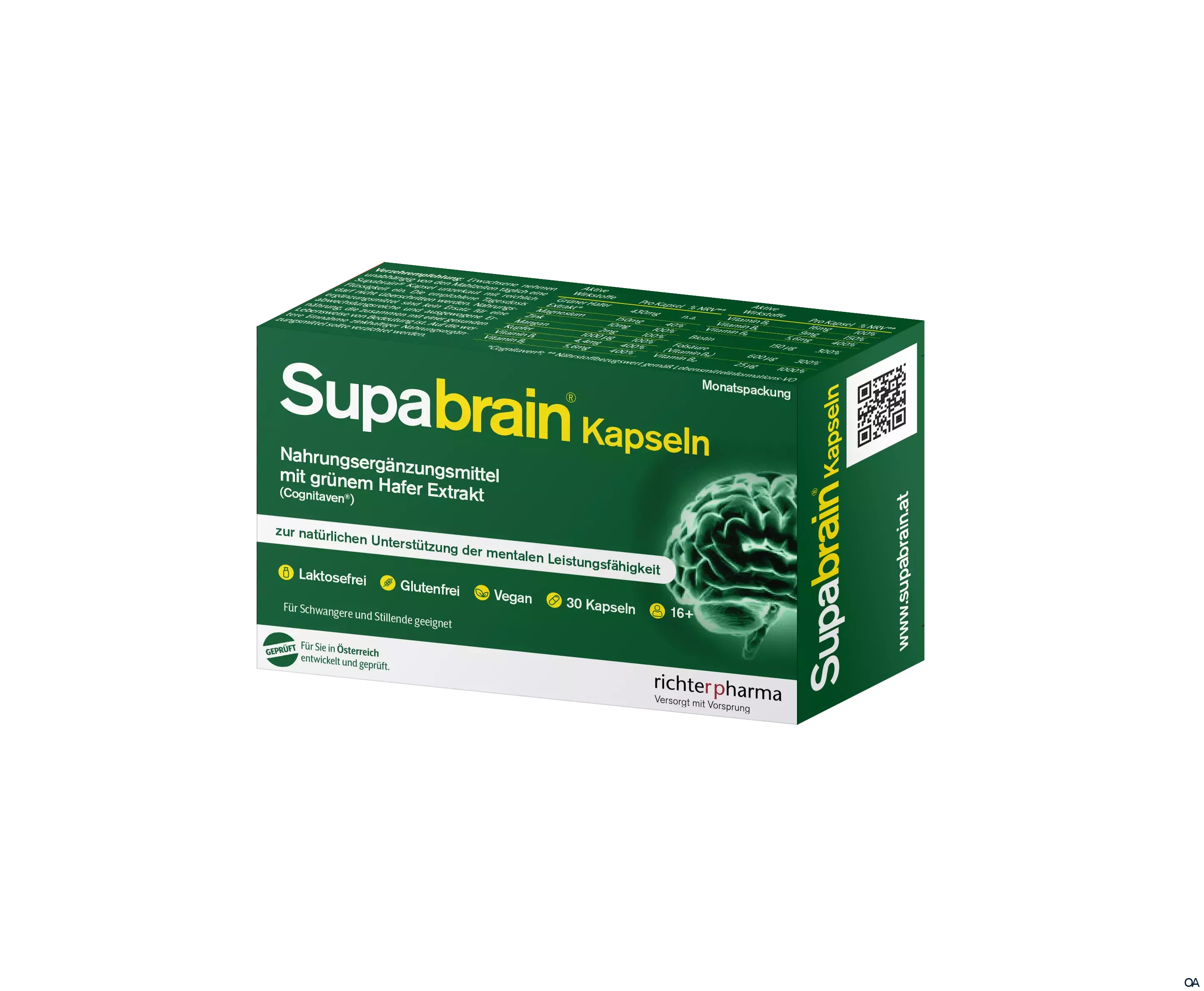 Supabrain® ist ein Nahrungsergänzungsmittel mit Grünem Hafer Extrakt (Cognitaven®), den Mineralstoffen Magnesium und Zink, einem vollständigen B-Vitamine-Komplex sowie den Spurenelementen Mangan und Kupfer. Supabrain® liefert dir somit alle wichtigen Nährstoffe für die optimale Versorgung deines Gehirns.