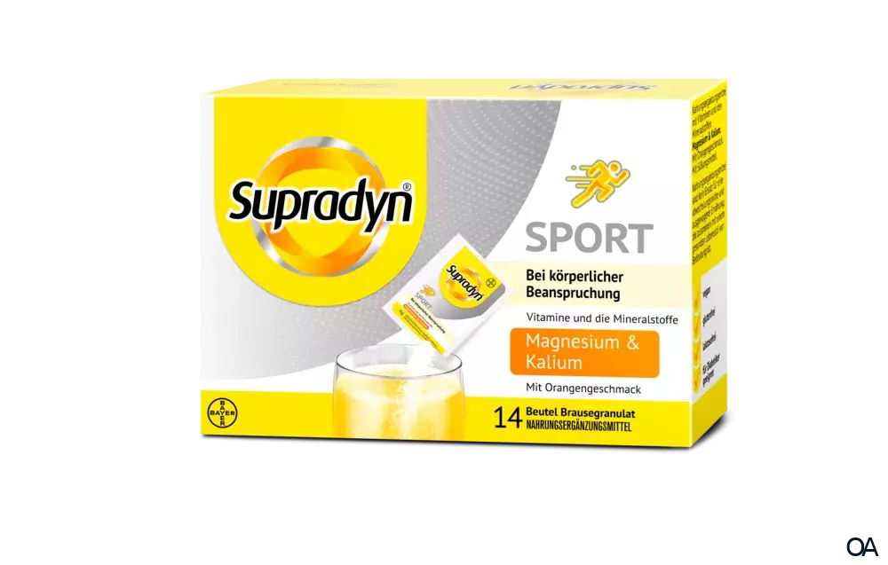 - Regeneration: Eine optimale Regeneration ist für eine Leistungssteigerung wichtig. Das Auffüllen der Energie- und Nährstoffspeicher sowie ausreichende Flüssigkeitszufuhr unterstützen den Köper in der Ruhephase. Die ausgewogene Kombination, der in Supradyn® SPORT enthaltenen Mikronährstoffe hilft, den durch Schwitzen entstanden Elektrolytverlust auszugleichen und die Speicher mit ausgewählten Vitaminen und Mineralstoffen wieder aufzufüllen. Zusätzlich tragen die Vitamine B6, B12, Folsäure und C zur Verringerung von Müdigkeit und Ermüdung bei.
