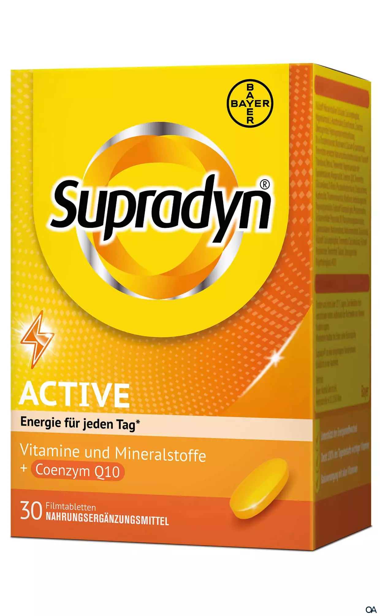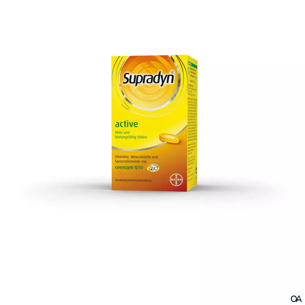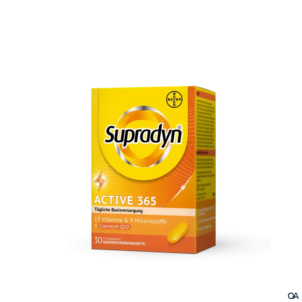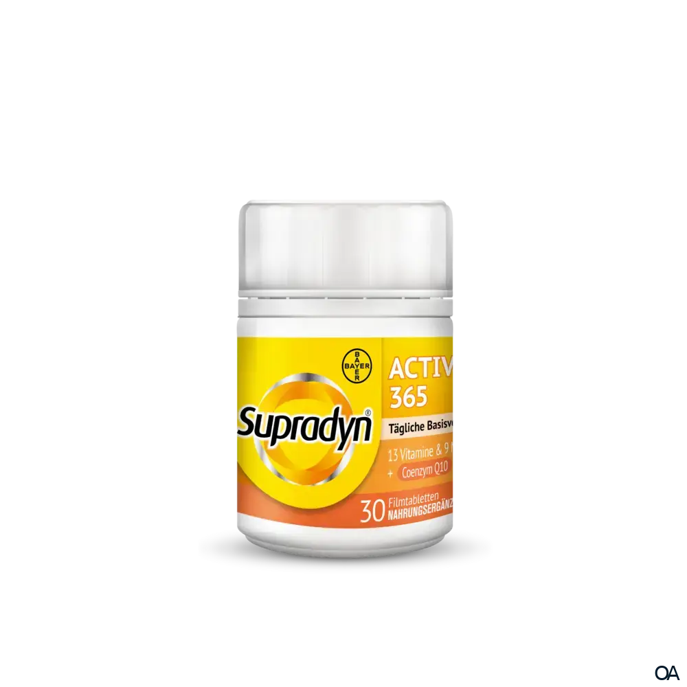 Supradyn® active 365 Filmtabletten sind ein Nahrungsergänzungsmittel mit allen 13 Vitaminen, 9 Mineralstoffen sowie Coenzym Q10. Die spezielle Dosierung versorgt den Körper mit wichtigen Vitaminen und Mineralstoffen des täglichen Bedarfs.