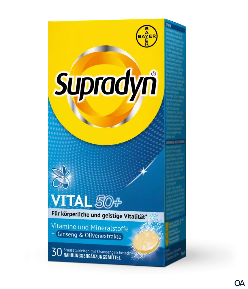 - Zusätzlich enthält Supradyn Vital 50+ hochwertige Extrakte aus der Olive mit wertvollen sekundären Pflanzenstoffen, den sogenannten Olivenpolyphenolen. Diese haben eine antioxidative Wirkung und tragen dazu bei, die Blutfette vor oxidativen Stress zu schützen.