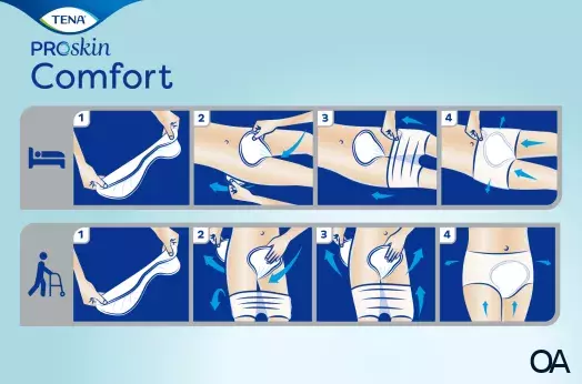 TENA ProSkin Comfort kann ganz einfach im Stehen oder Liegen gewechselt werden. Das bewährte Inkontinenzprodukt wird durch die wiederverwendbaren TENA Fix Fixierhosen in Position gehalten.