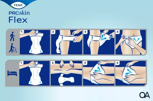 Das ergonomische Design der TENA ProSkin Flex erleichtert die Handhabung und eignet sich sowohl für Männer als auch Frauen, die mobil, eingeschränkt mobil oder immobil sind. Für die beste Passform befolgen Sie bitte die Gebrauchsanleitung.