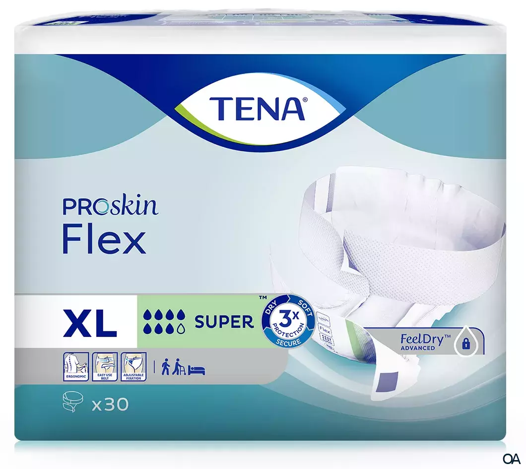 TENA Flex Super ist eine flexible Inkontinenz-Schutzhose mit Taillenband, die ein einfacheres und ergonomischeres Wechseln des Produkts ermöglicht. Sie eignet sich für mobile, eingeschränkt mobile oder immobile Menschen. TENA ProSkin Flex mit FeelDry Advanced™-Technologie zieht schnell Flüssigkeit von der Oberfläche weg und hält die Haut trocken.