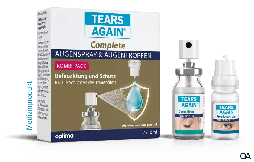 Der Kombi-Pack Tears Again® Complete Augenspray und Augentropfen spendet Befeuchtung und Schutz, für alle Schichten des Tränenfilms. Eine gute Wahl für alle, die an trockenen, brennenden sowie gereizten Augen leiden.
