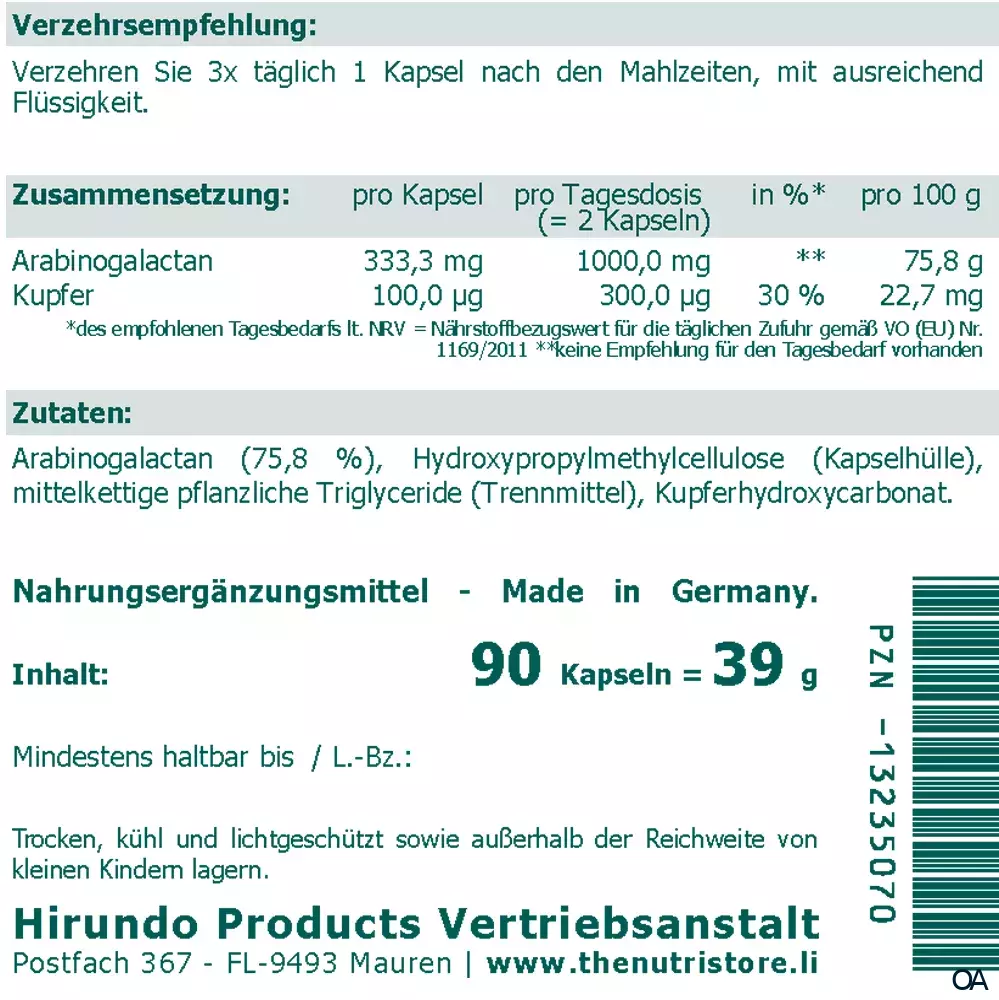 - Zutaten: Arabinogalactan (75,8 %), Hydroxypropylmethylcellulose (Kapselhülle), mittelkettige pflanzliche Triglyceride (Trennmittel), Kupferhydroxycarbonat.