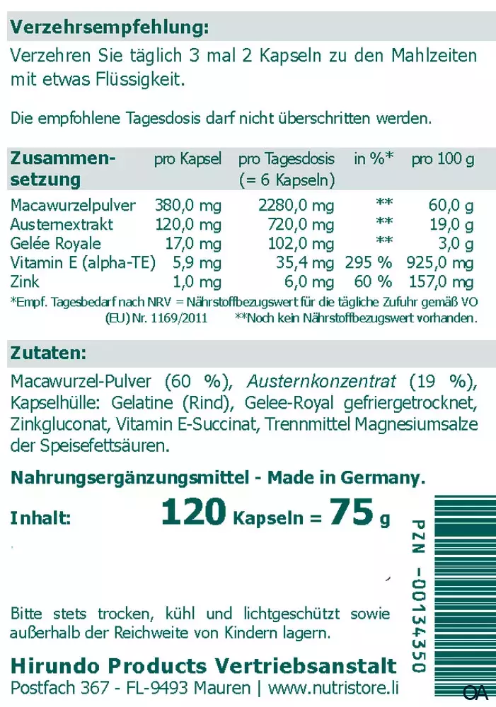 - Zusammensetzung pro Tagesdosis (= 6 Kapseln) in %*: Macawurzelpulver 2280,0 mg **, Austernextrakt 720,0 mg **, Gelée Royale 102,0 mg **, Vitamin E (alpha-TE) 35,4 mg 295 %, Zink 6,0 mg 60 %. *Empf. Tagesbedarf nach NRV = Nährstoffbezugswert für die tägliche Zufuhr gemäß VO (EU) Nr. 1169/2011. **noch keine EU-Empfehlung für den Tagesbedarf vorhanden.