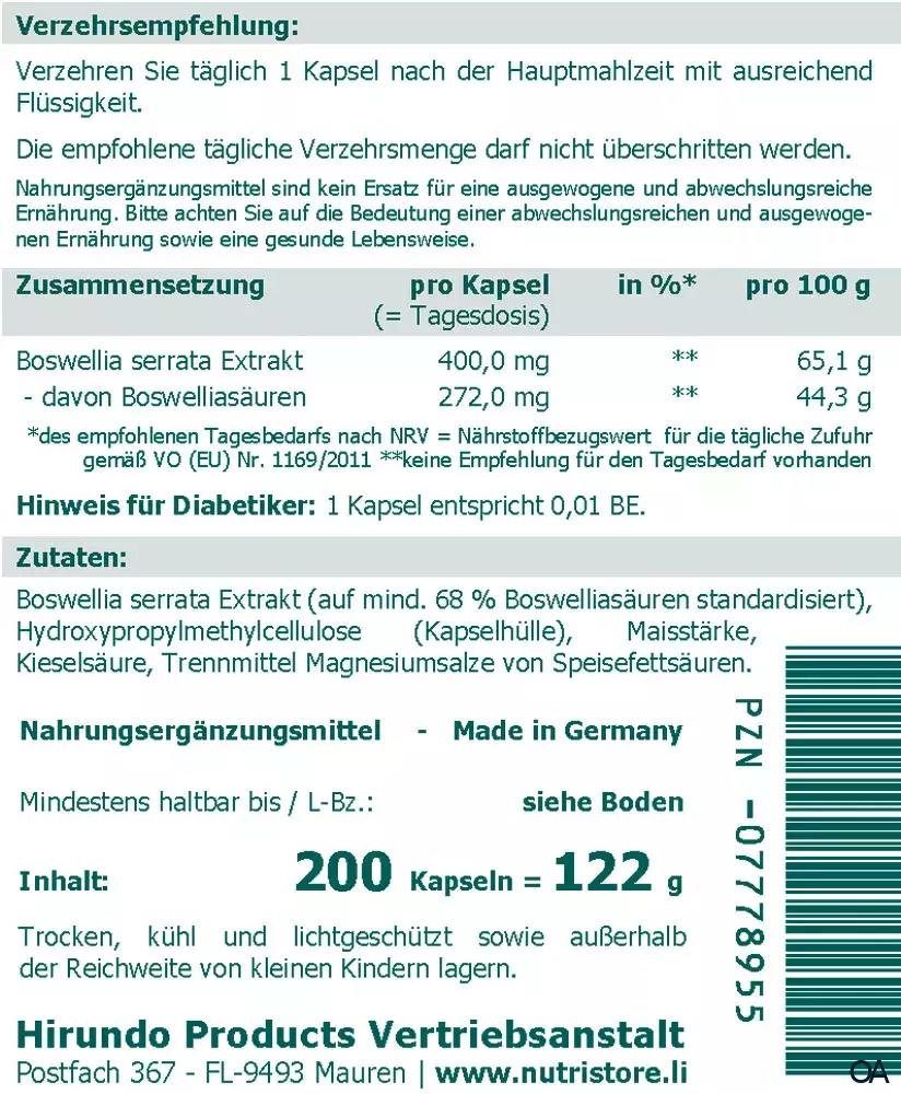 - Zusammensetzung pro Kapsel ( = Tagesdosis) in %*: Boswellia serrata Extrakt 400,0 mg **– davon Boswelliasäuren 272,0 mg **. *des empfohlenen Tagesbedarfs nach NRV = Nährstoffbezugswert für die tägliche Zufuhr gemäß VO (EU) Nr. 1169/2011. **keine Empfehlung für den Tagesbedarf vorhanden.
