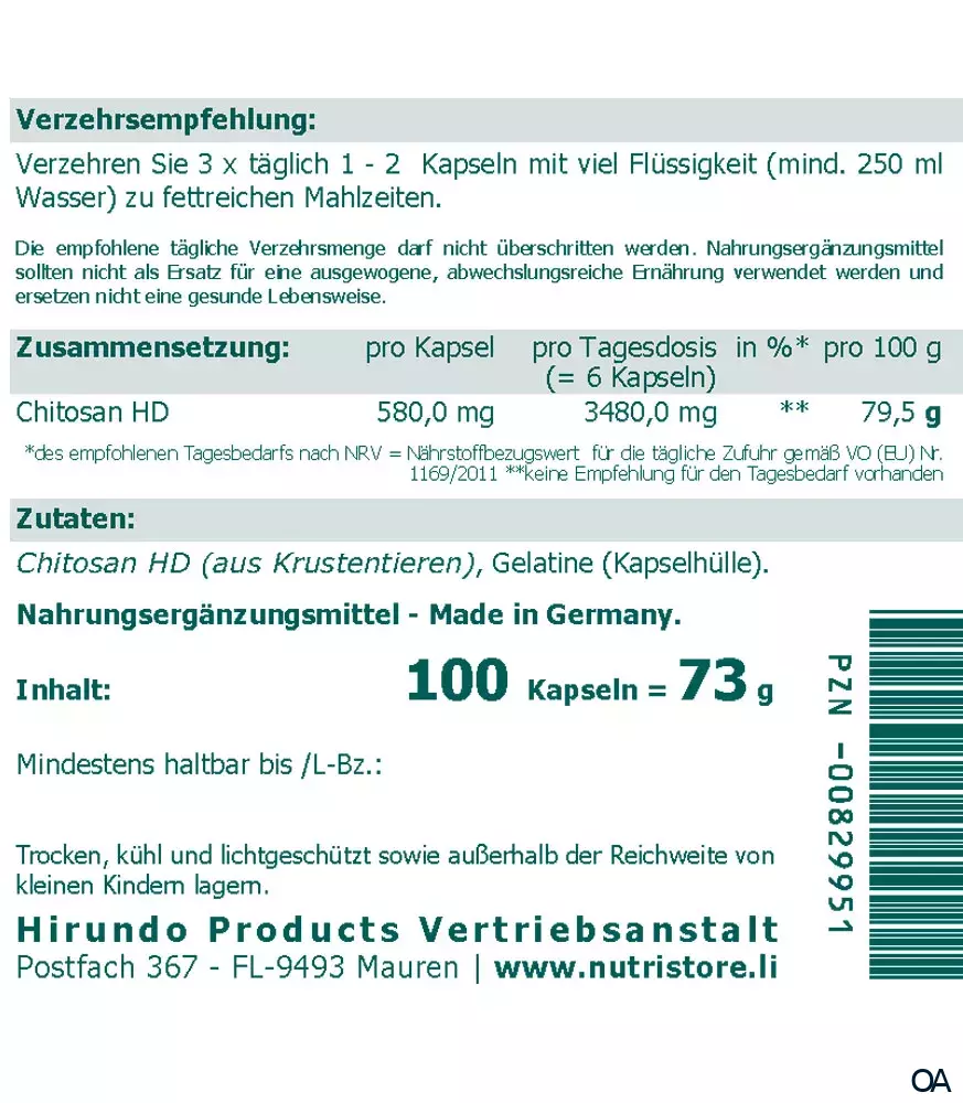 - Zutaten: Chitosan HD (aus Krustentieren), Gelatine (Kapselhülle).