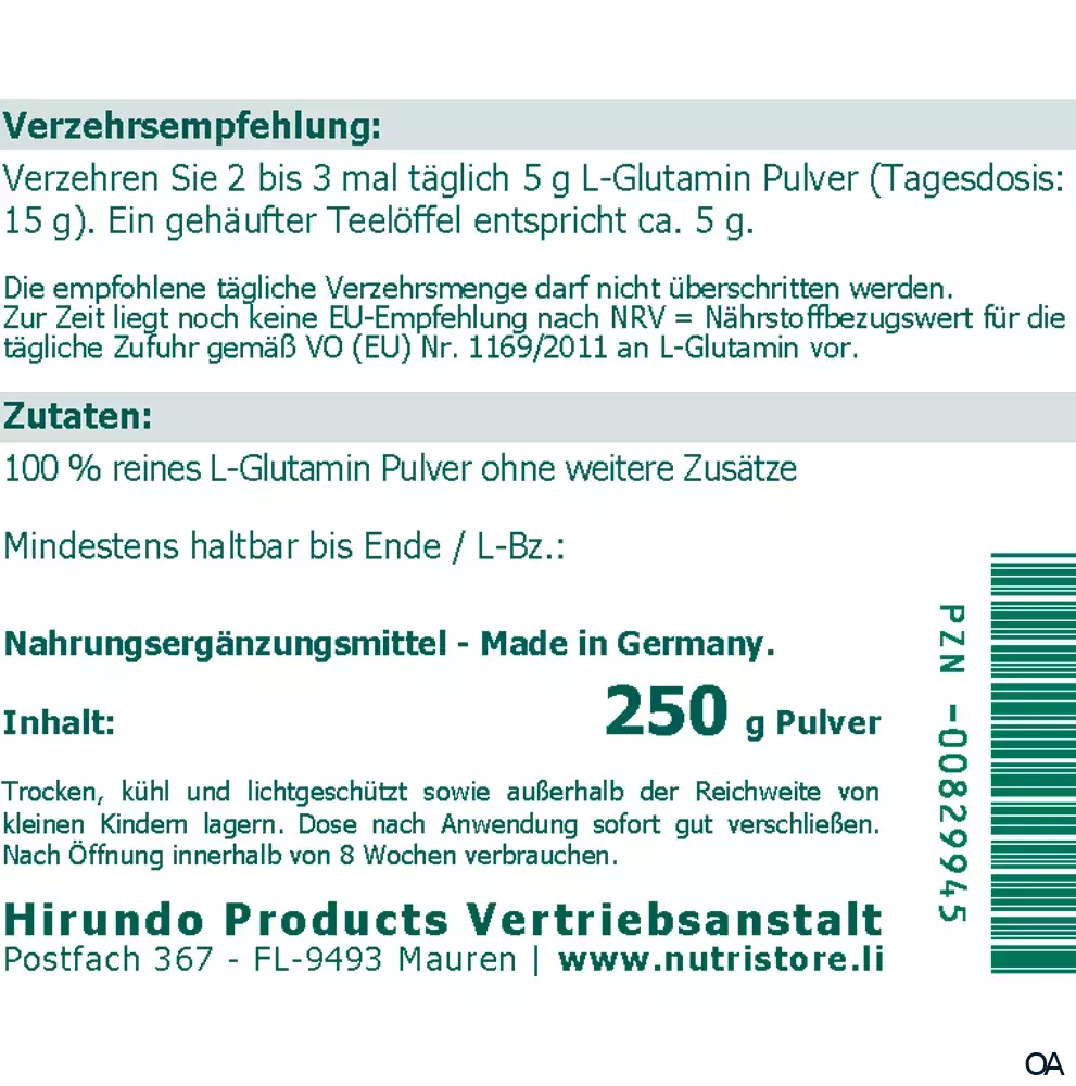 Zutaten: 100 % reines L-Glutamin Pulver ohne weitere Zusätze. Zur Zeit liegt noch keine EU-Empfehlung nach NRV = Nährstoffbezugswert für die tägliche Zufuhr gemäß VO (EU) Nr. 1169/2011 an L-Glutamin vor.