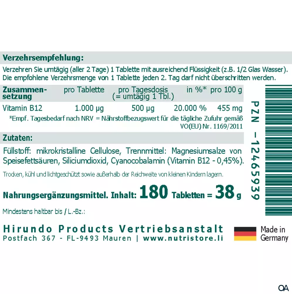 - Zusammensetzung pro Tablette ( jeden 2. Tag) in %*: Vitamin B12 500 µg 20.000 %. *Empf. Tagesbedarf nach NRV = Nährstoffbezugswert für die tägliche Zufuhr gemäß VO(EU) Nr. 1169/2011.